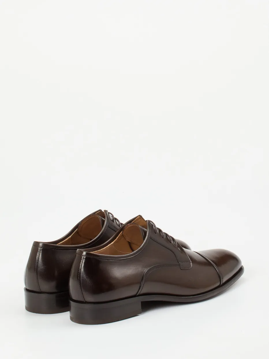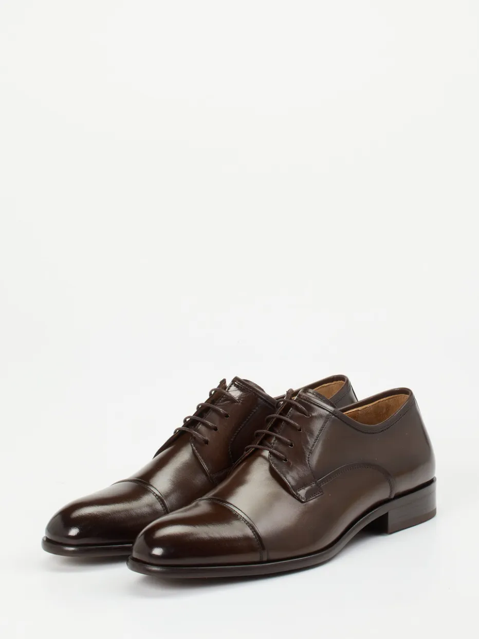 Glänzendes Büffelleder, klassisch-schlanker Leisten und präzise Captoe-Form machen diesen Derby-Schnürer zum stilvollen Essential für formelle Anlässe.