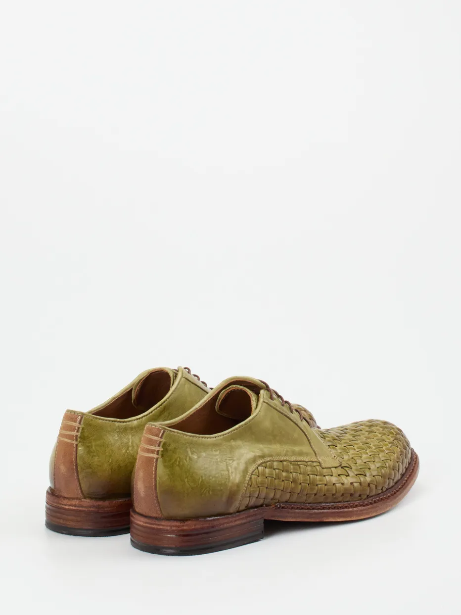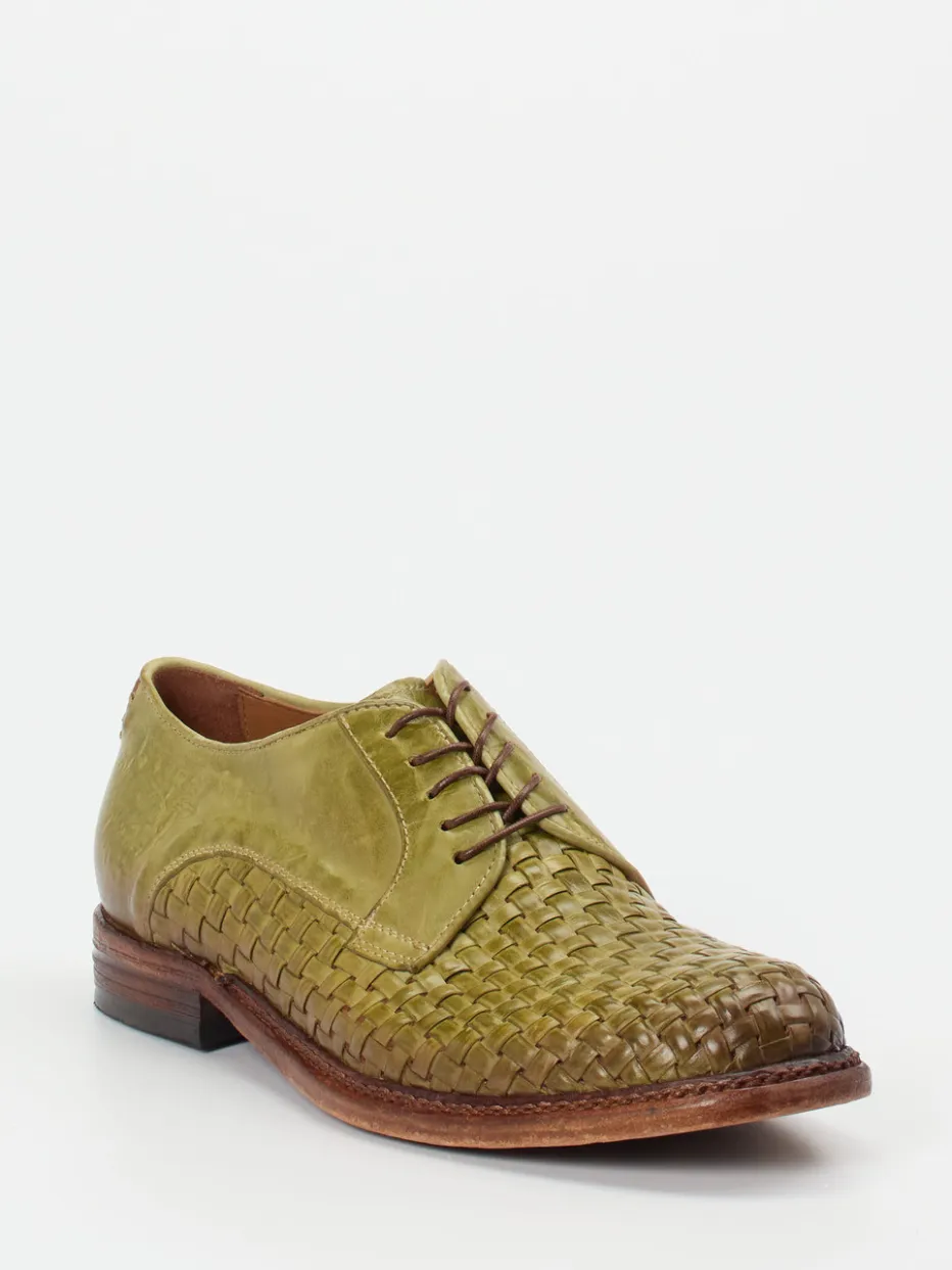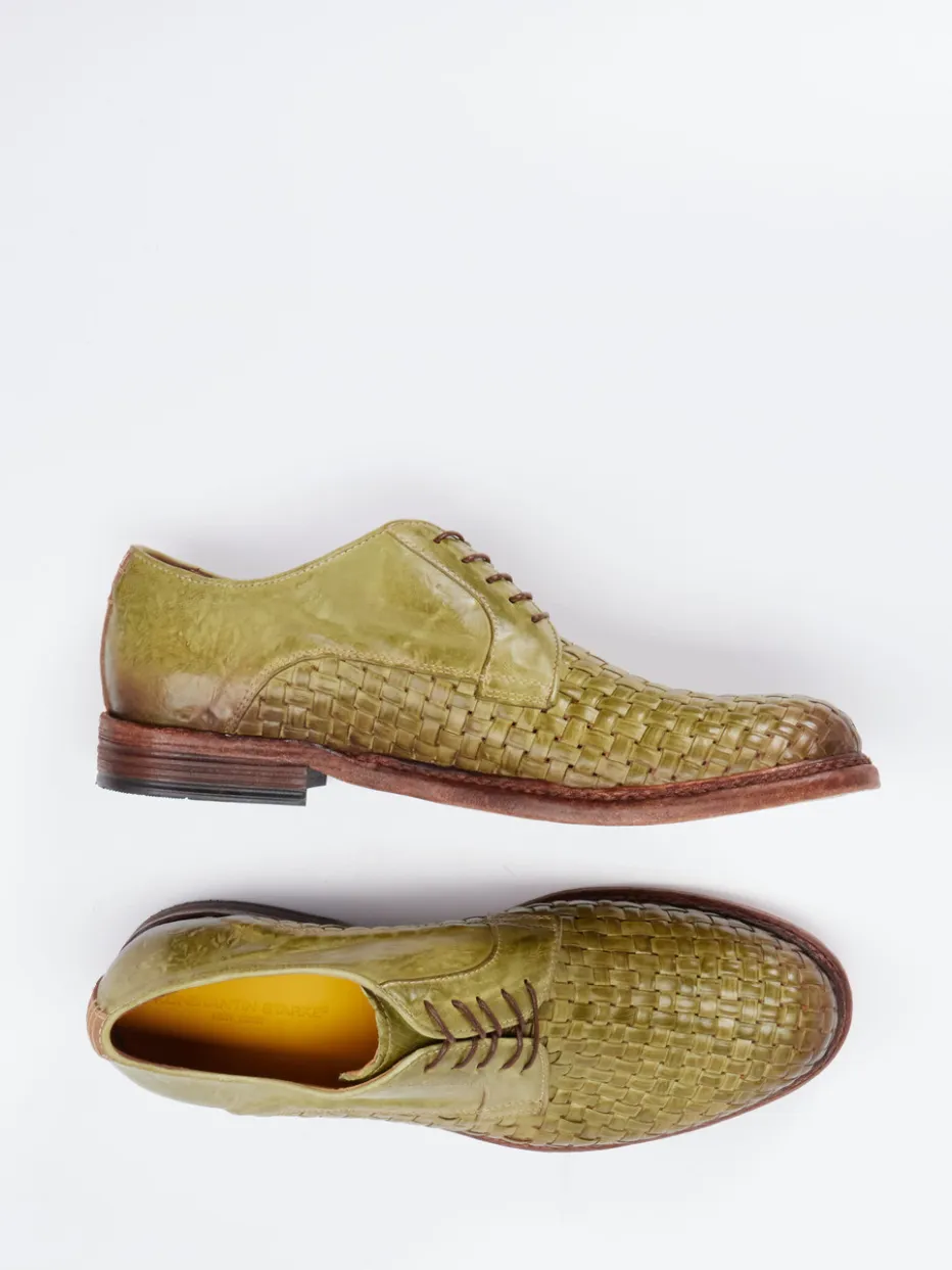 Im Büroalltag oder bei sommerlichen Freizeit-Anlässen überzeugt das Modell durch olivgrünes, glänzendes Flechtleder – fachmännisch verarbeitet mit sichtbaren Steppnähten und angenehm weichem Kalblederfutter. Die klassische Rundsilhouette mit 5-Loch-Schnürung und natürlichem Kontrastabsatz sorgt für souveräne Präsenz. Eine Ledersohle mit Gummieinsätzen sichert Halt auf urbanem Terrain. Stilistisch greift der Schuh aktuelle SS24-Trends wie Natural Tones und strukturierte Materialien auf und passt hervorragend zu hellen Leinenhosen.