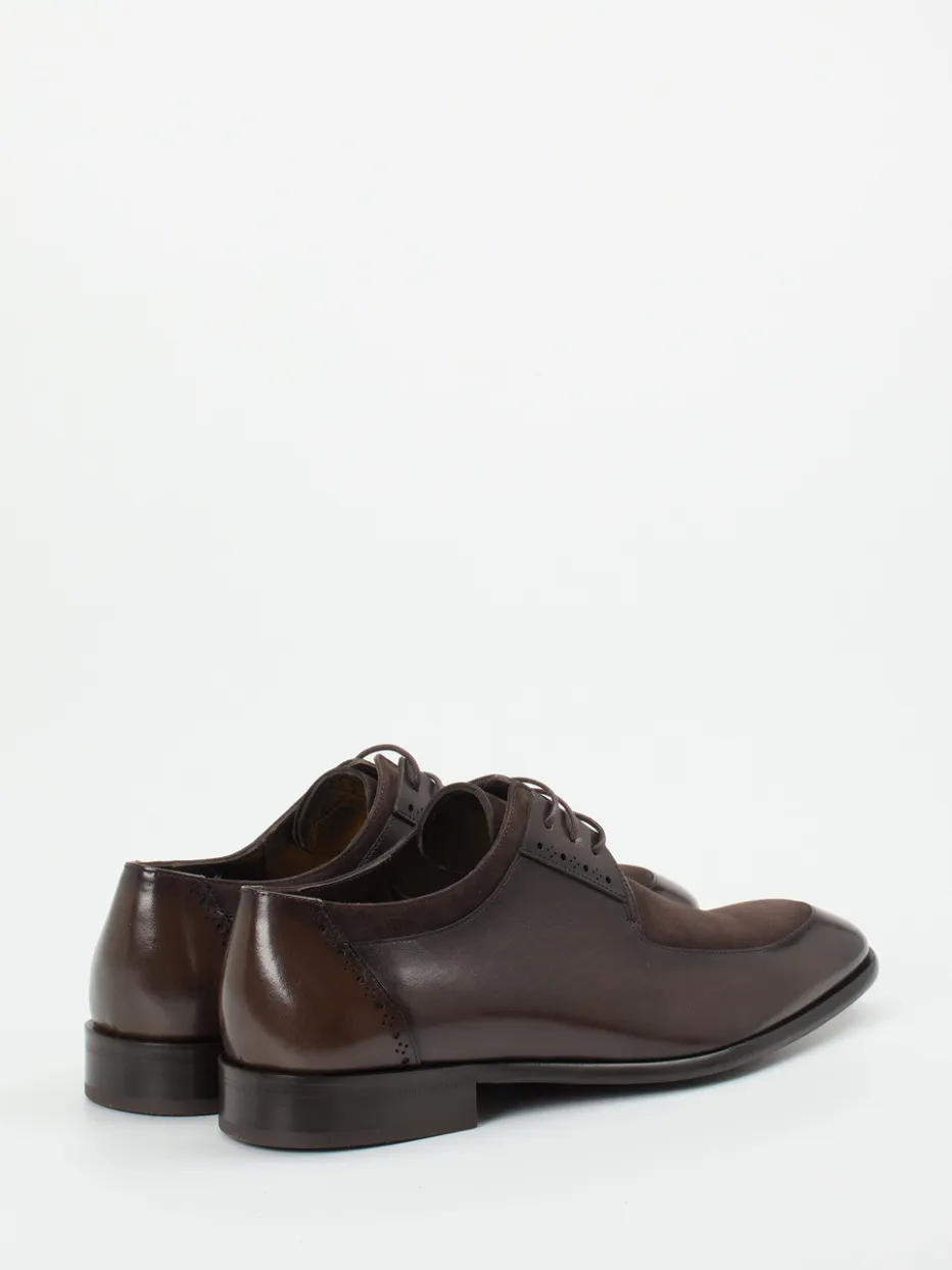 Der elegante Materialkontrast aus Glatt- und Veloursleder sowie eine edel geprägte Ledersohle kennzeichnen diesen Derby als stilvolle Wahl für formelle Anlässe.