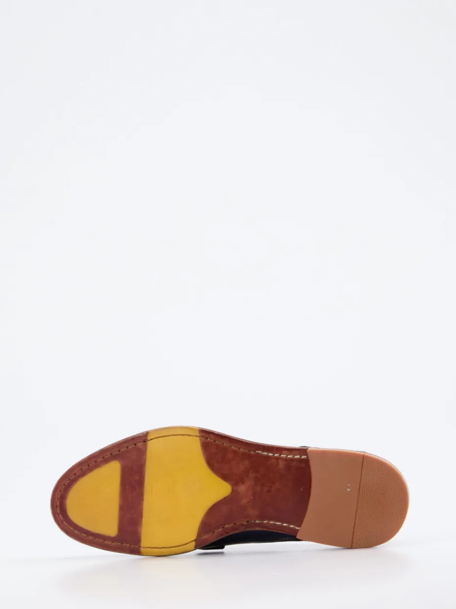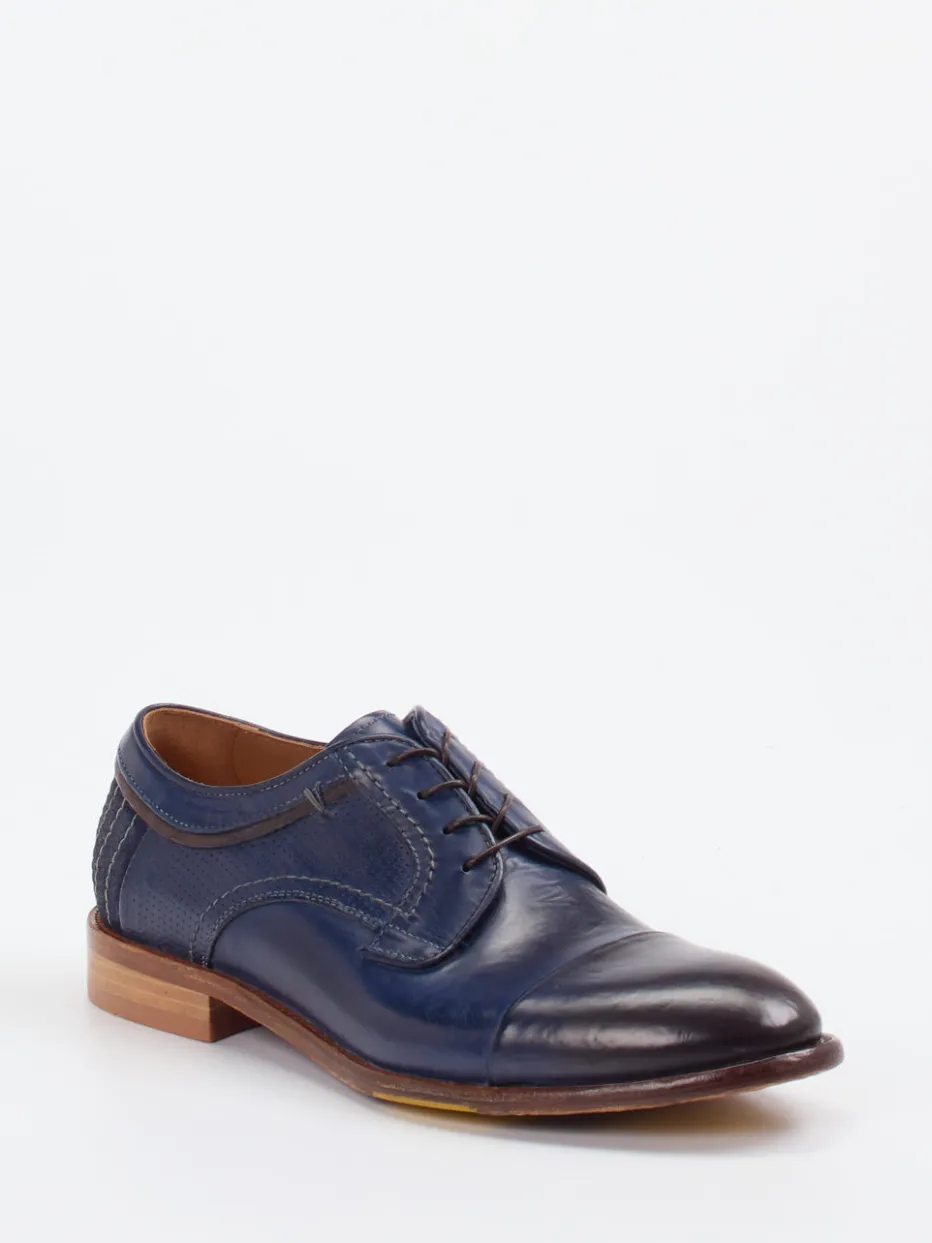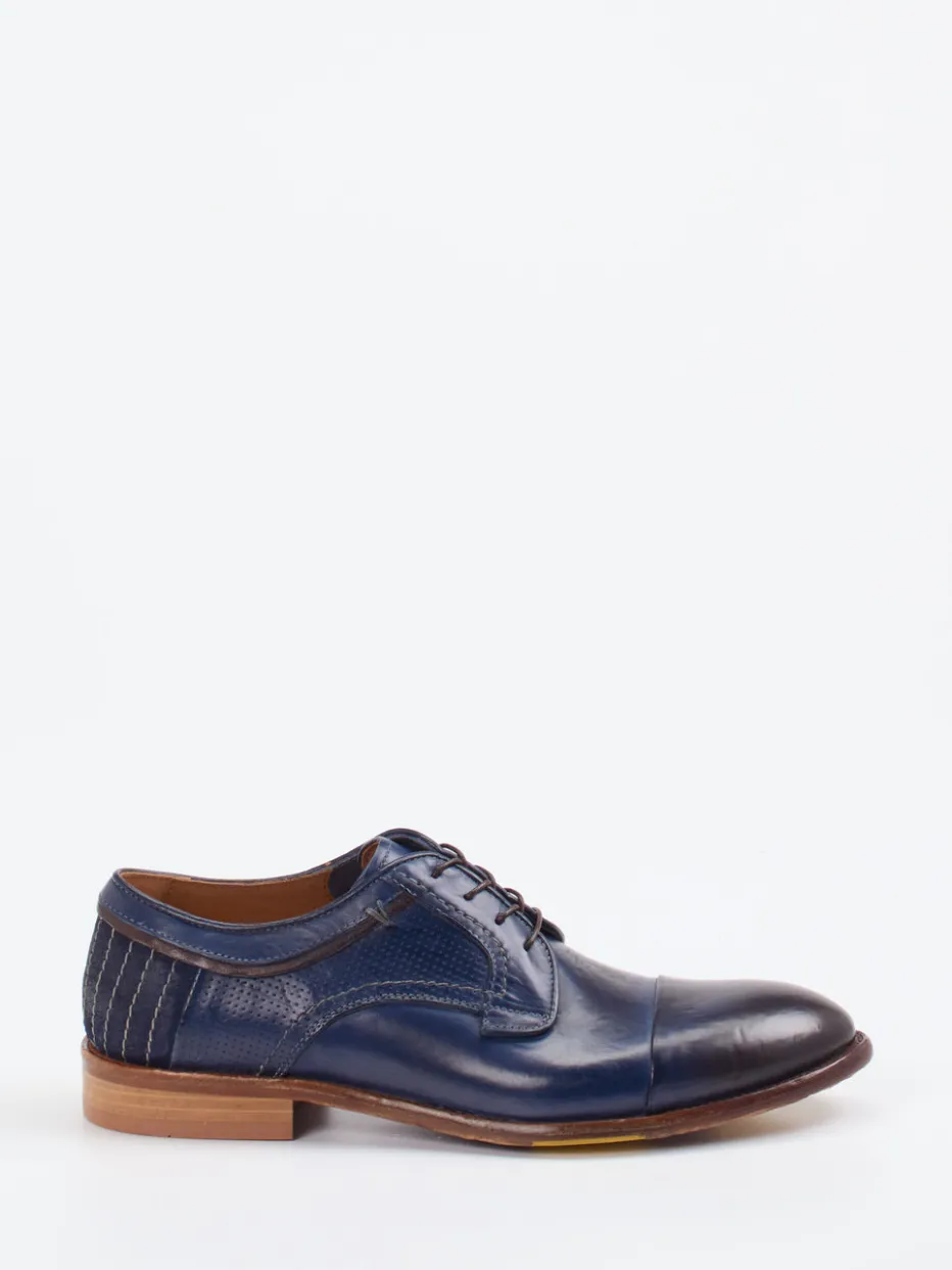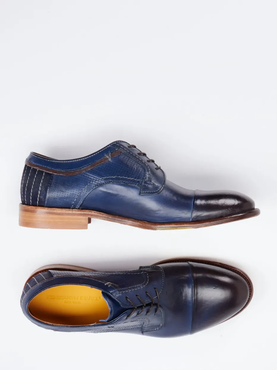 Ob im Büro oder beim gehobenen Freizeit-Look – dieser Schnürschuh überzeugt durch seine handwerkliche Verarbeitung und Details mit Charakter. Glänzendes, navyblaues Kalbleder trifft auf strukturierte Veloursleder-Akzente im Fersenbereich. Das Zwei-Ton-Design mit Kontrastnähten unterstreicht die klassische, flache Silhouette mit Minimalismus-Flair. Die Ledersohle mit gelbem Gummieinsatz sorgt für festen Stand und angenehmes Tragen. Perfekt kombinierbar mit hellen Business-Hemden oder dunklen Jeans.