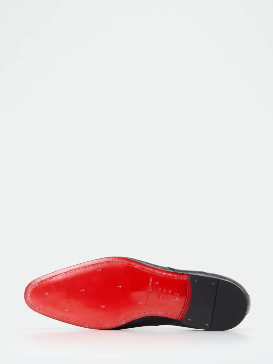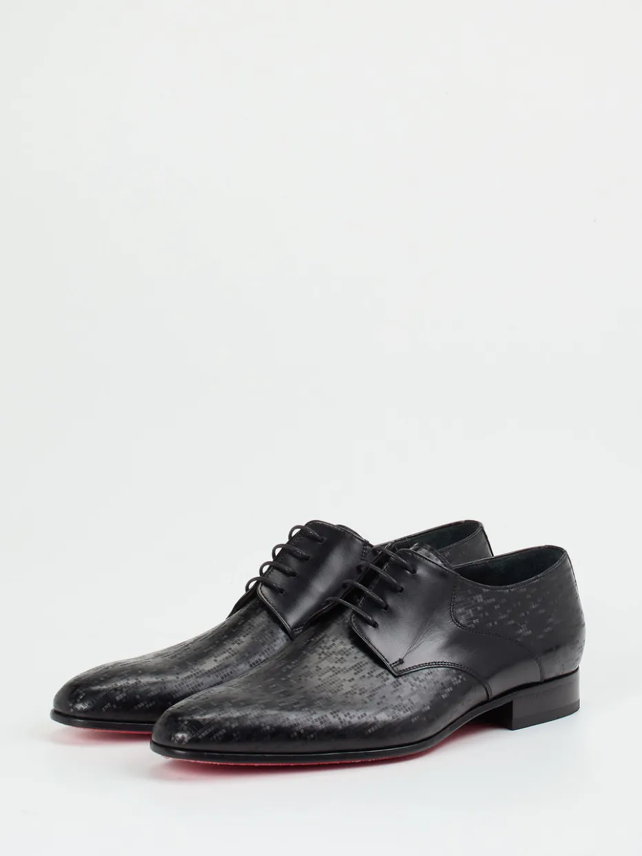Markanter Derby mit glänzendem Pixelmuster aus hochwertigem Kalbleder. Die rote Ledersohle setzt ein modisches Statement im formellen Kontext.