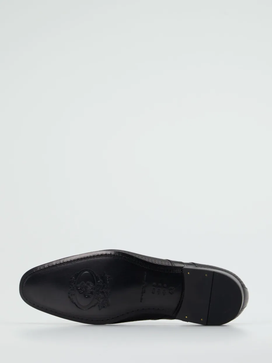 Struktur und Stil auf den Punkt gebracht.Konstantin Starke zeigt mit diesem Herrenschnürer in Derby-Form einen geschmackvollen Vertreter der Business-Classics. Für den souveränen Auftritt im Büro oder bei formellen Veranstaltungen bietet das geprägte Leder mit feiner Flechtstruktur eine markante Optik bei gleichzeitig dezenter Ton-in-Ton-Farbgebung. Die klassisch-langgezogene Form, eine geschlossene 5-Loch-Schnürung sowie die geprägte Ledersohle unterstreichen das elegante Erscheinungsbild. Schwarzes Kalbleder trifft hier auf ein zurückhaltendes, jedoch wirkungsvolles Design – passend zum Trend „Quiet Luxury“. Lässt sich ideal mit schwarzen Gürteln und anthrazitfarbenen Business-Hosen kombinieren. Markentypisch vereint: kompromisslose Qualität und minimalistische Ästhetik.