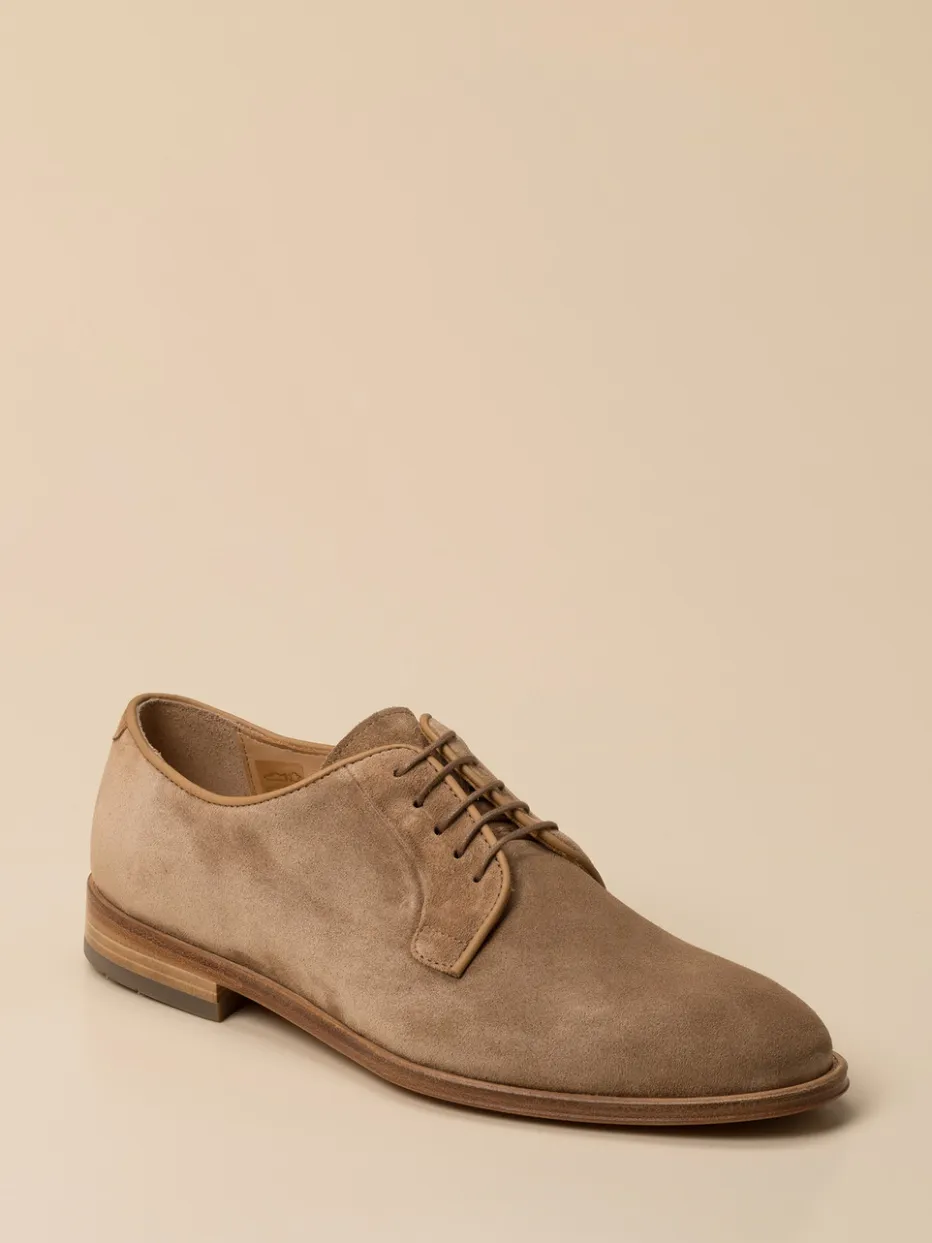 Der cleane Derby im sandfarbenen Velours überzeugt mit handwerklicher Verarbeitung und smartem Business-Charakter – ein Highlight für stilbewusste Minimalisten.