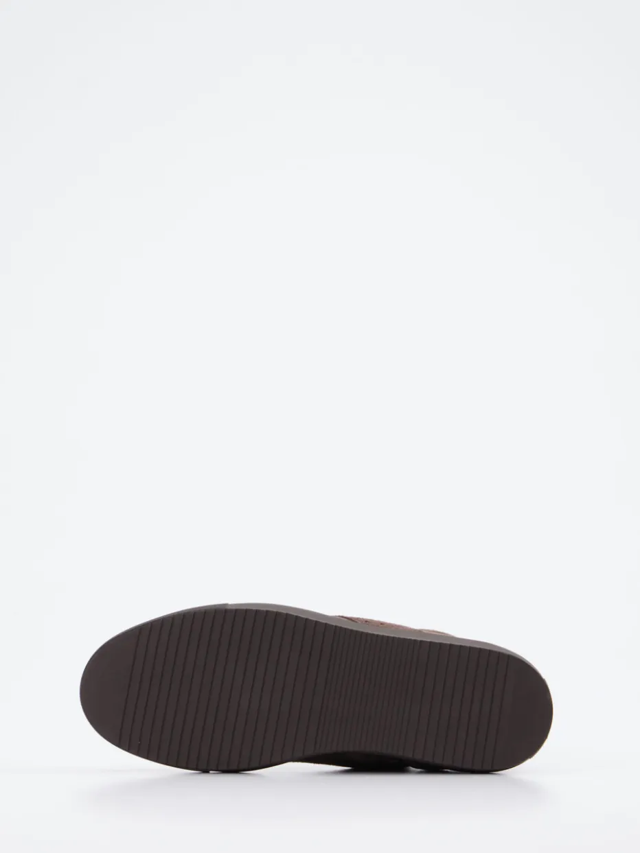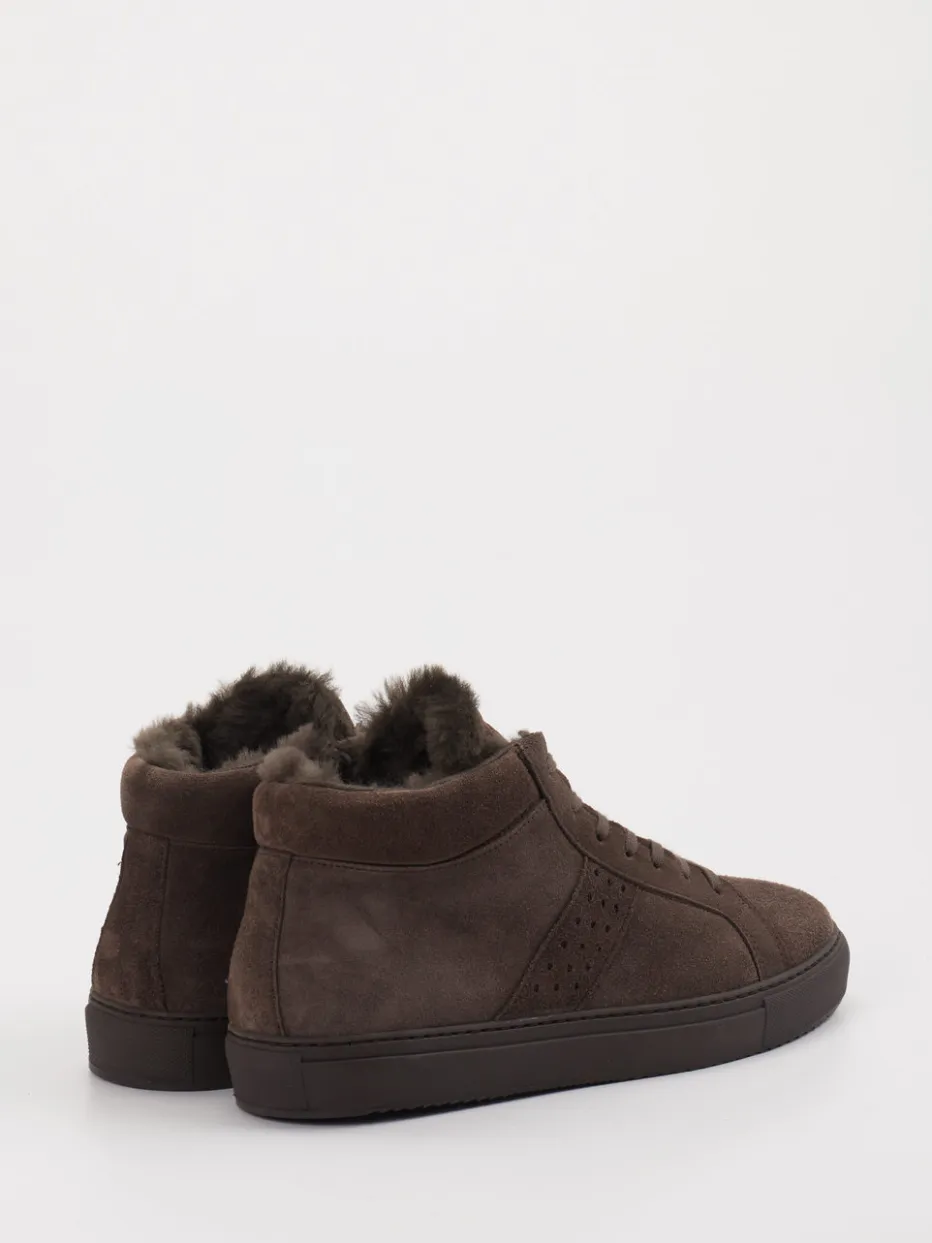 Winterkomfort trifft minimalistisches Design.Konstantin Starke präsentiert mit diesem High-Top-Sneaker ein komfortstarkes Herrenmodell für die kühleren Monate. Perfekt für kalte Tage kombiniert der Schuh hochwertiges Veloursleder mit einem warmen Lammfellfutter. Die mittelbraune Farbgebung und das matte Finish unterstreichen die klare Silhouette mit hohem Schaft. Ton-in-Ton-Nähte und ein perforiertes Seitenpanel setzen dezente Akzente, während die Kombination aus Schnürung und Reißverschluss schnelles Anziehen ermöglicht. Die flache Gummisohle sorgt für Stabilität im Alltag. Inspiriert von Streetwear und dem Trend zu „Quiet Luxury“, passt er ideal zu winterlichen Casual-Looks. Wärmender Komfort und durchdachte Details mit urbanem Anspruch.
