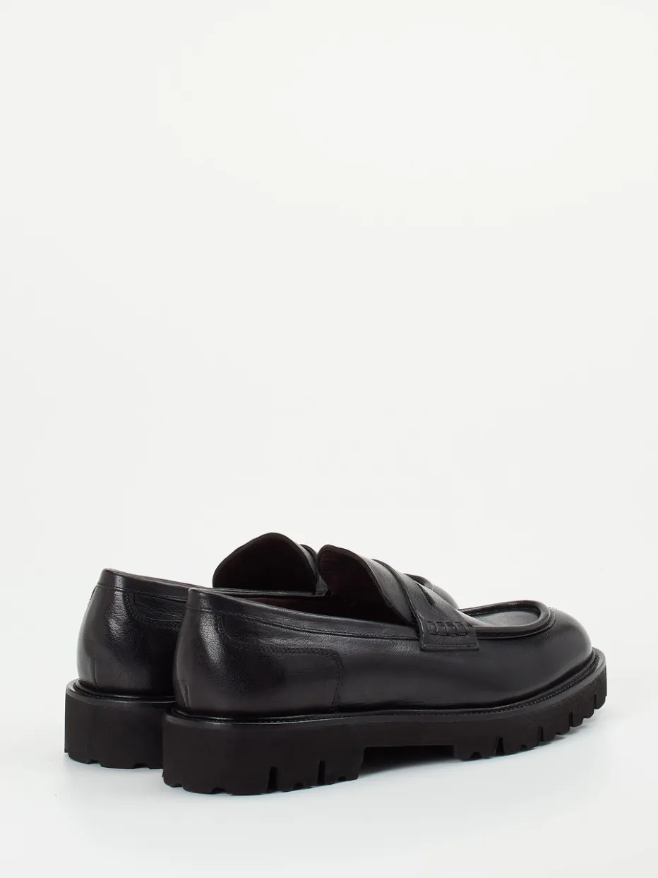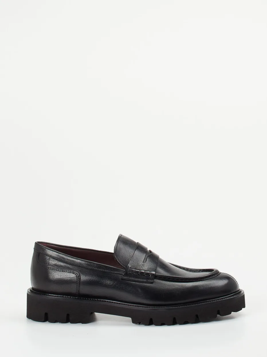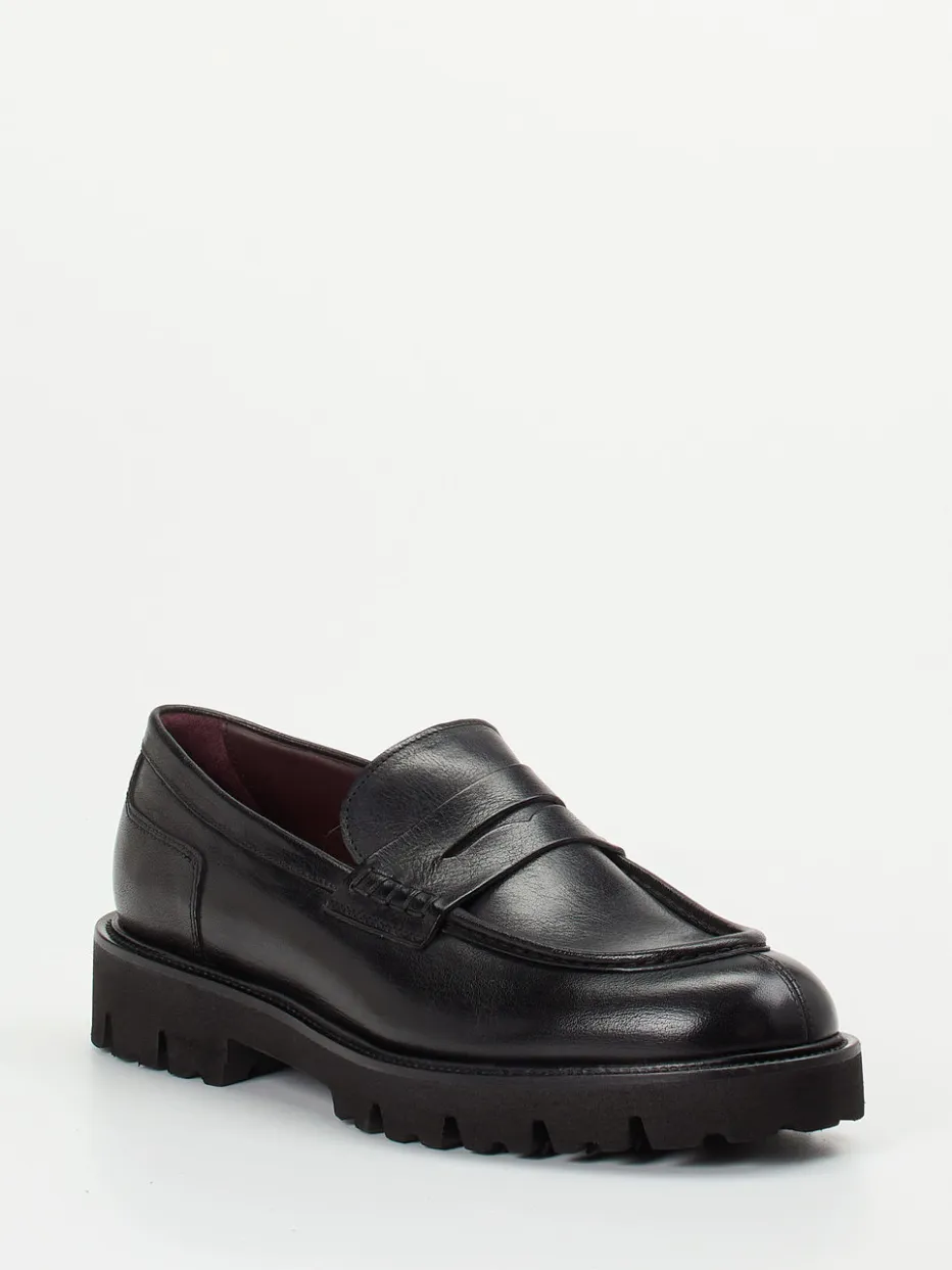 Die kraftvoll profilierte Sohle bringt moderne Dynamik in den klassischen Penny-Loafer-Look. Hochwertiges Büffelleder mit glänzender Oberfläche verleiht dem Modell eine elegante Präsenz.