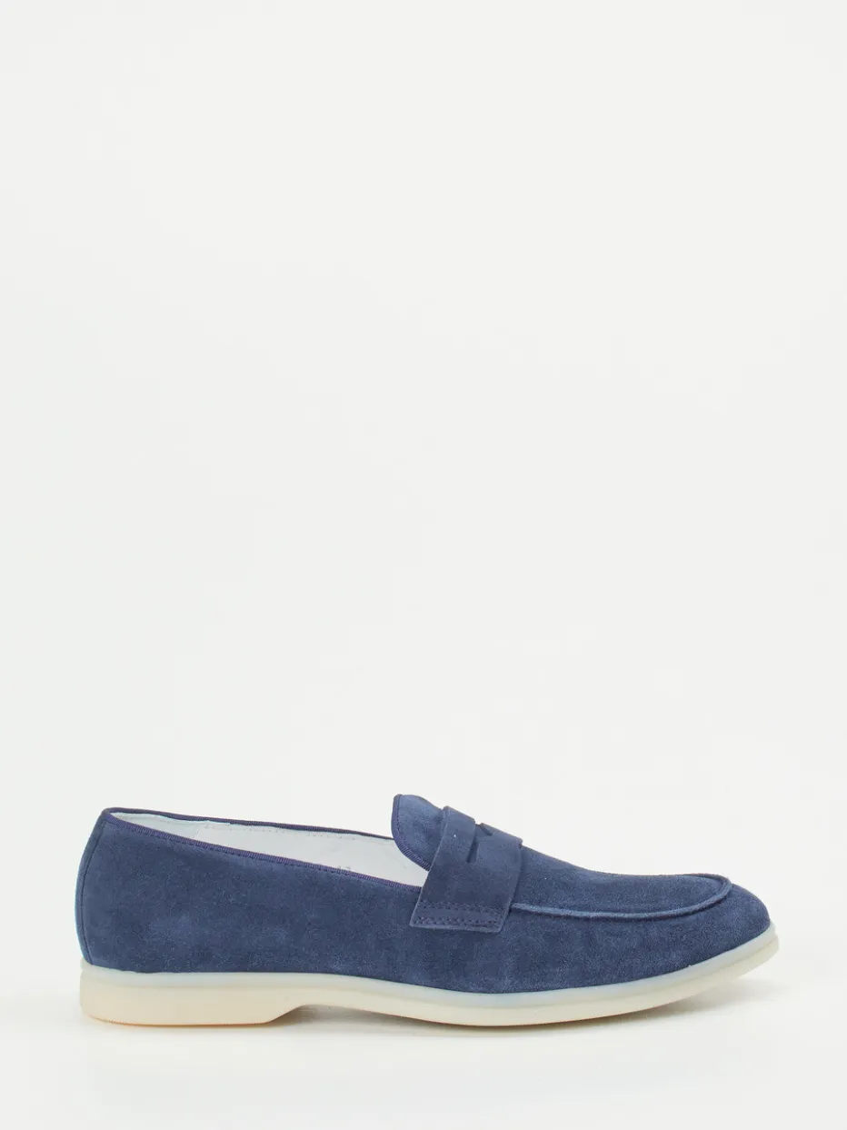 Dieser marineblaue Loafer überzeugt mit samtigem Veloursleder, leichter Gummisohle und klassischen Details im Penny-Stil – ideal für sommerlichen Chic zwischen Business und Freizeit.