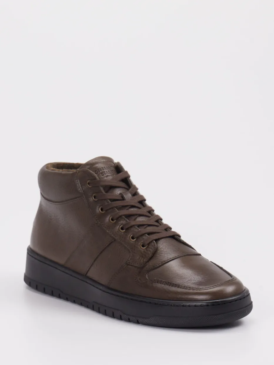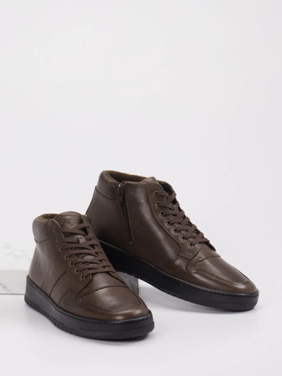 Herbsttaugliche Alltagssilhouette in gedecktem Braun.Konstantin Starke präsentiert mit diesem Mid-Top-Sneaker ein modernes Herrenmodell für die Übergangszeit. Der in Dunkelbraun gehaltene Sneaker kombiniert hochwertiges Kalbleder mit leicht genarbter Oberfläche und einem warmen Textilfutter, das dem Träger an kälteren Tagen angenehme Wärme schenkt. Die knöchelhohe Form mit Schnürung und seitlichem Reißverschluss erlaubt bequemen Einstieg und optimalen Halt. Dezente Ton-in-Ton-Nähte und matte Metallösen betonen den minimalistischen Look. Die rutschfeste Gummisohle unterstreicht die Urban-Utility-Ausrichtung. Ideal zu Denim, Cord oder Wolle für einen casual-maskulinen Style im Herbst. Komfortorientiertes Design trifft auf dezente Streetwear-Ästhetik von Konstantin Starke.