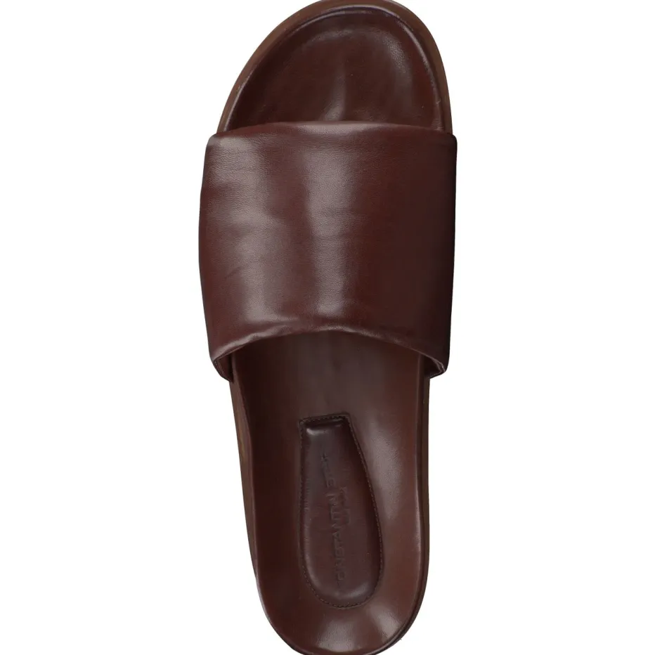 Sommerstil mit italienischer Raffinesse.Konstantin Starke präsentiert mit dieser Pantolette ein Herrenmodell, das reduzierte Eleganz mit hochwertigem Komfort verbindet. Ideal für entspannte Freizeitmomente und warme Sommertage: Das dunkelbraune Lammleder ist fein gearbeitet und zeigt sich in glänzender Optik mit Ton-in-Ton-Nähten. Die klassische Form mit breitem, leicht gepolstertem Riemen und offenem Zehenbereich sorgt für luftigen Tragekomfort. Innen überzeugt ein ergonomisch geformtes, lederbezogenes Fußbett, ergänzt durch eine halb aus Leder, halb aus Gummi gefertigte Laufsohle mit Vero-Cuoio-Prägung – ein Hinweis auf langlebige Herstellung in Italien. Zeitgeistiger Minimalismus trifft auf das Trendthema „Quiet Luxury“. Ein souveräner Begleiter für moderne Looks von Leinenhose bis Polohemd.