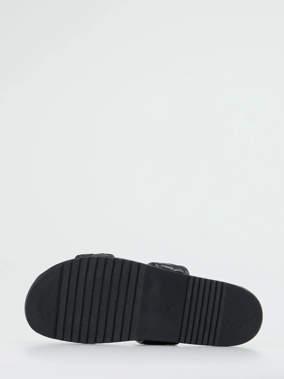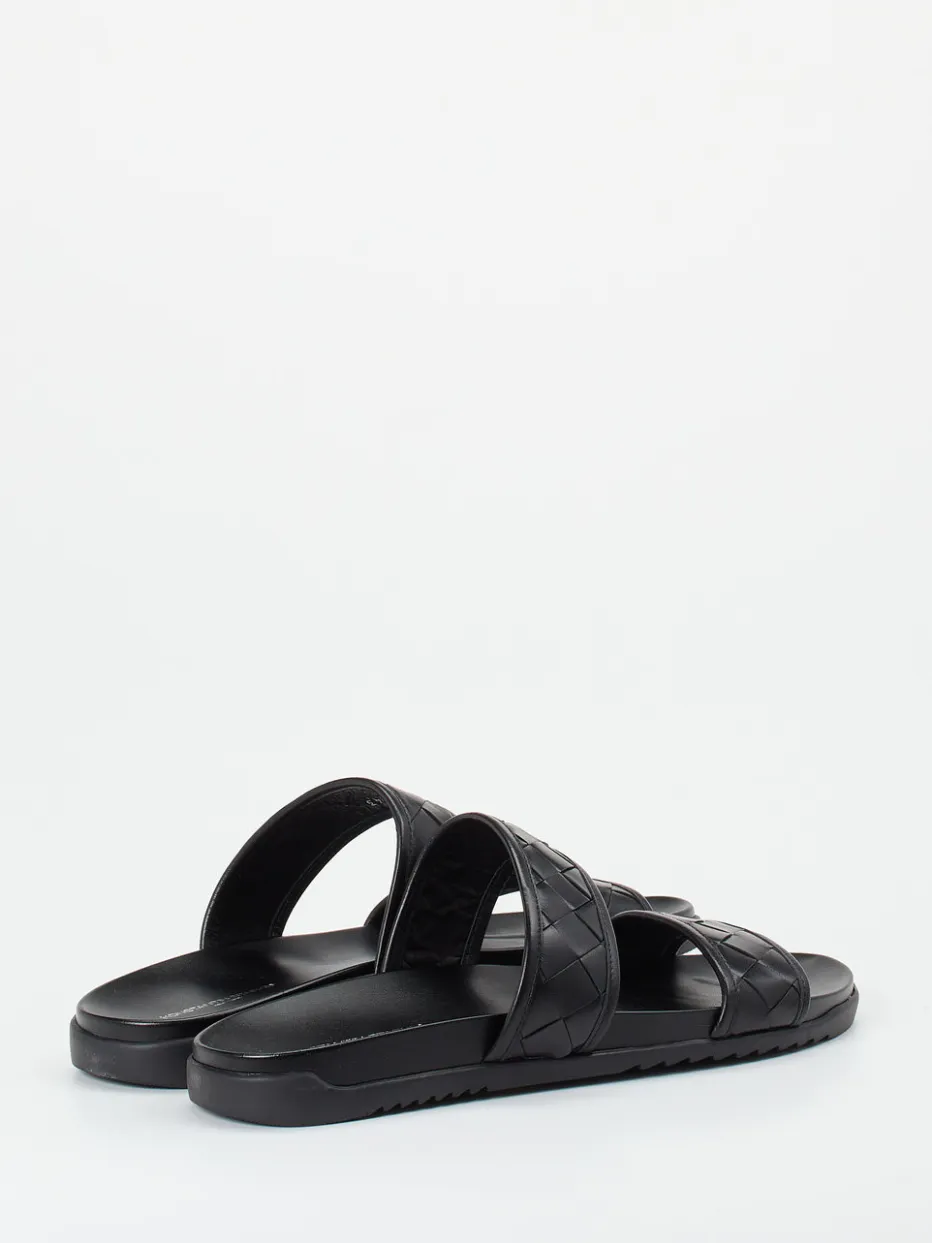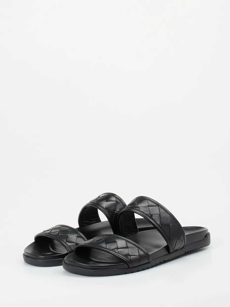 Die flachen Sandalen aus hochwertigem Flechtleder in tiefem Schwarz greifen mit ihrer matten Textur und der symmetrischen Zwei-Riemen-Silhouette aktuelle Minimalismus- und Quiet-Luxury-Trends auf. Das anatomisch geformte Tieffußbett mit Lederbezug sowie die griffig profilierte Gummisohle ergänzen den modischen Anspruch um komfortable Alltagstauglichkeit. Optimal kombinierbar mit luftigen Leinenshorts oder monochromen Streetwear-Outfits.