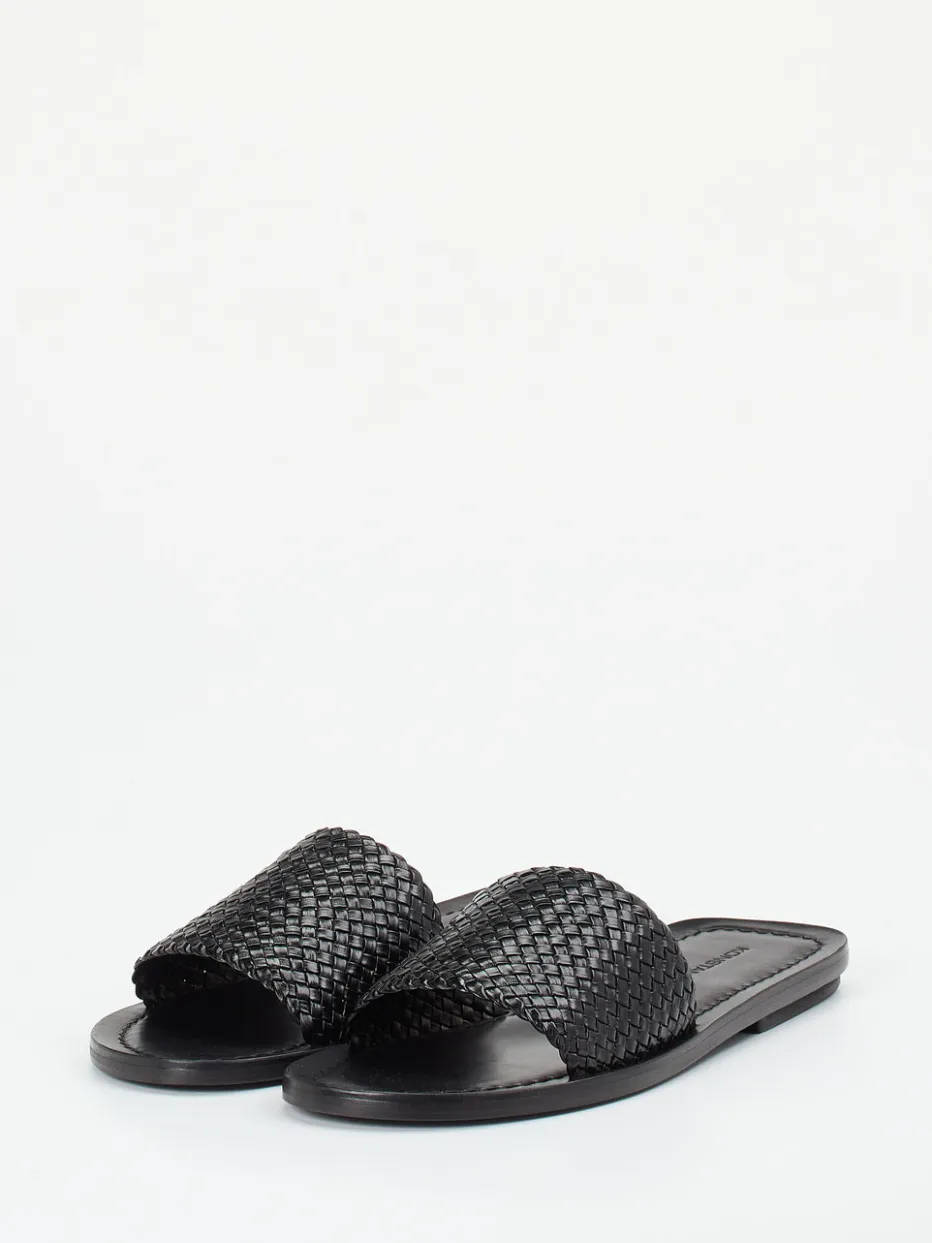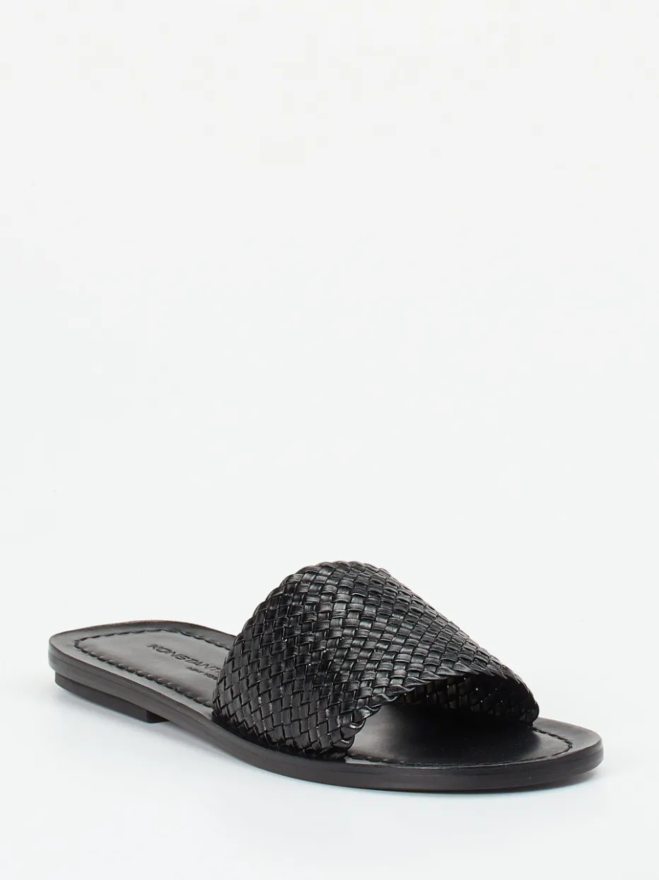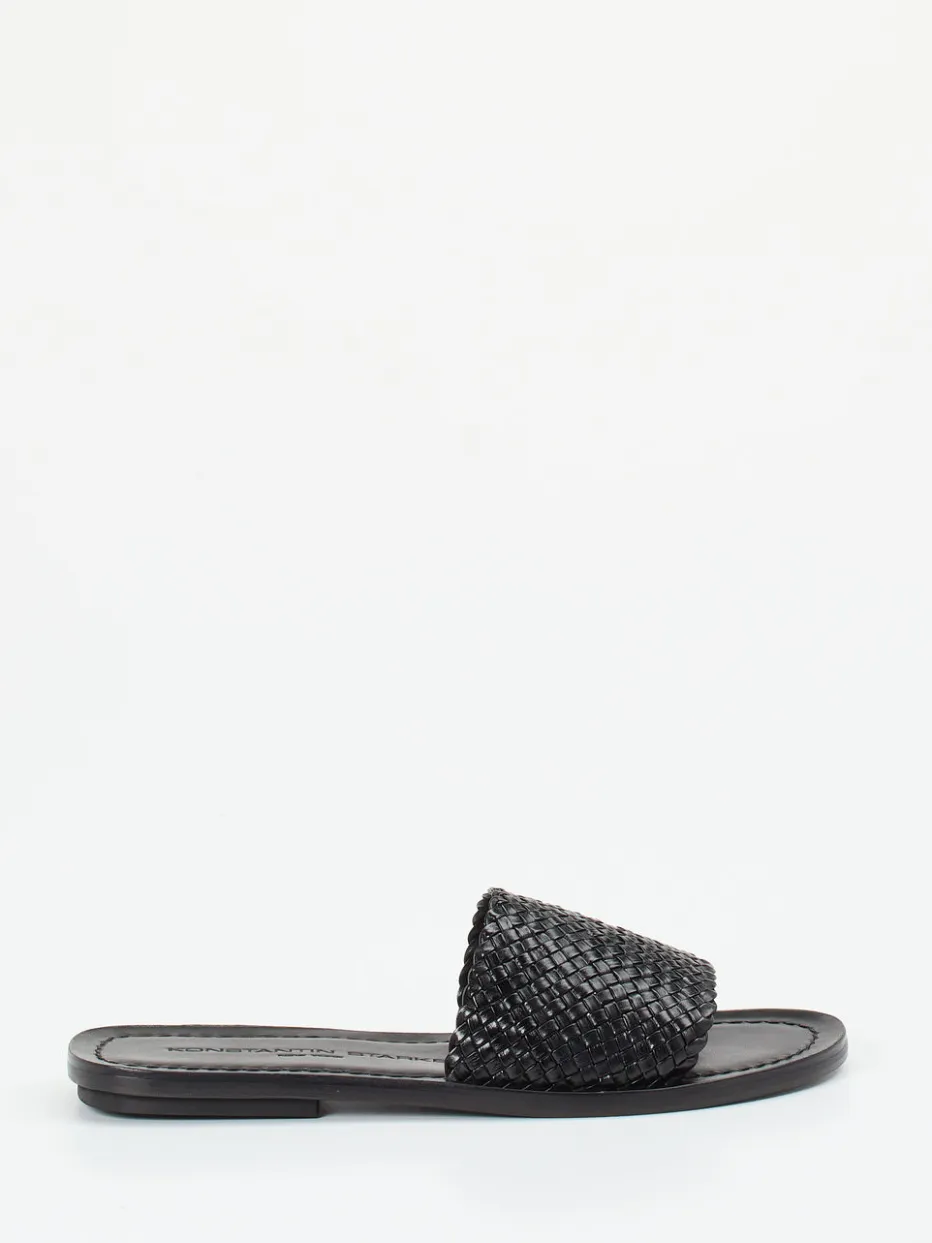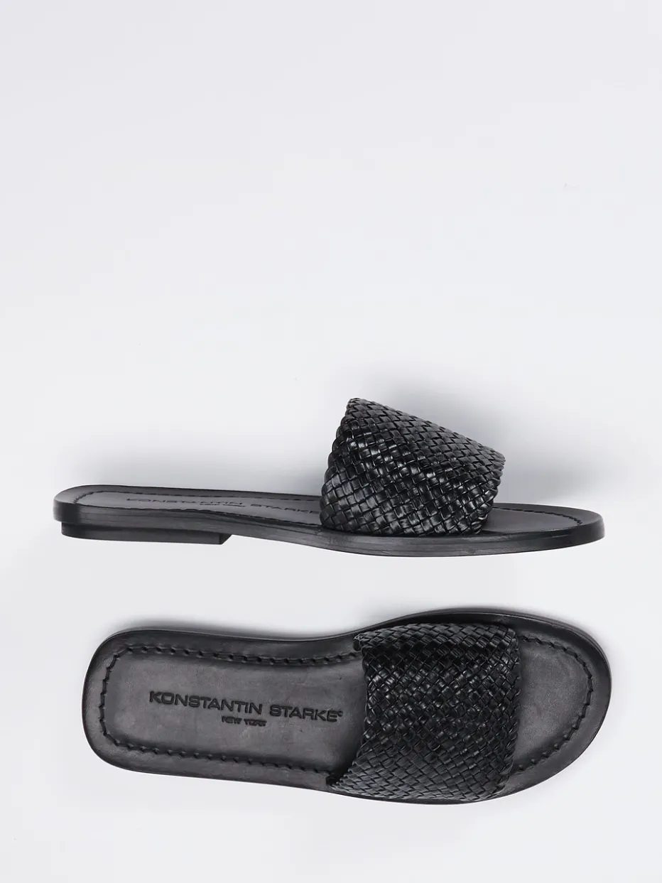 Handwerk trifft auf Reduktion.Konstantin Starke präsentiert mit diesen Damen-Sandalen ein minimalistisches Design für warme Tage. Gefertigt aus hochwertigem, schwarz gefärbtem Flechtleder mit mattierter Oberfläche, zeigen die Slides eine strukturierte Riemenkonstruktion ohne Verschluss. Die flache Ledersohle mit leicht glänzendem Finish sorgt für Tragekomfort und eignet sich optimal für trockene Untergründe. Die kantige Silhouette und Ton-in-Ton-Nähte unterstreichen den reduzierten Ausdruck, während eine sanfte Logo-Prägung das Fußbett akzentuiert. Inspiriert von Handwerkskunst und sommerlichem Texturspiel, lässt sich das Modell perfekt zu Naturtönen und klaren Linien kombinieren. Komfortabel, stilbewusst und zeitlos – Konstantin Starke steht für moderne Eleganz mit Understatement.