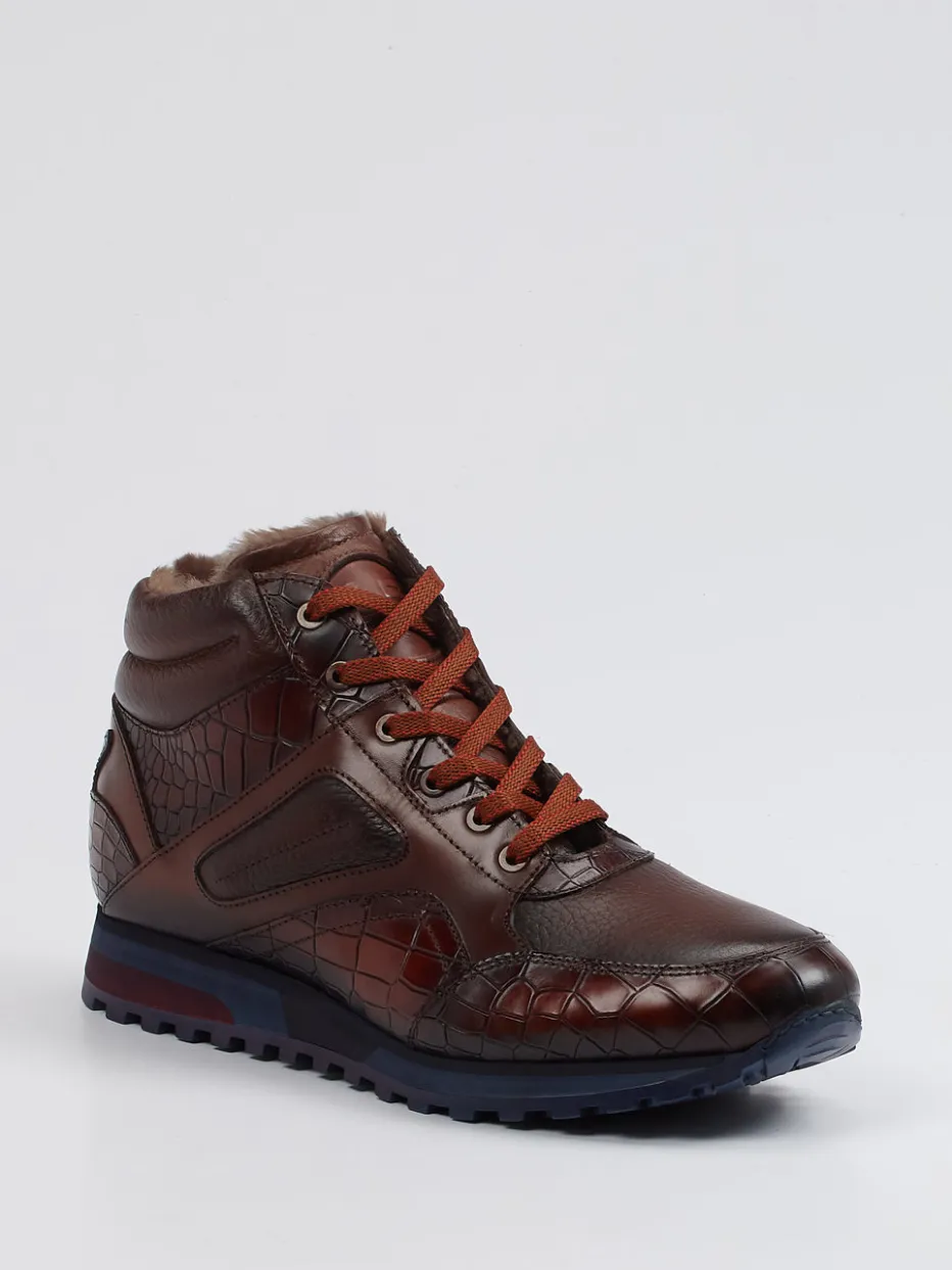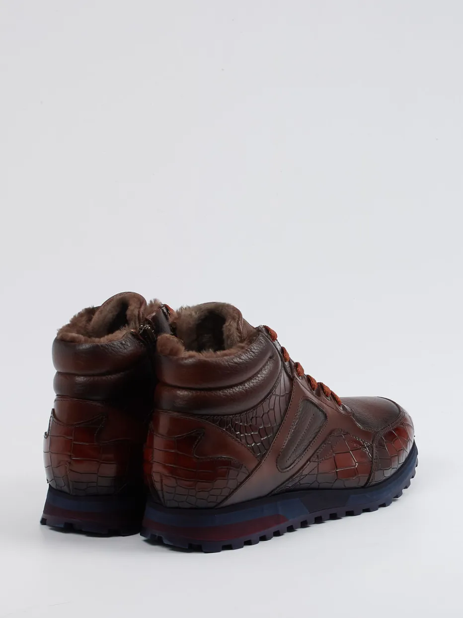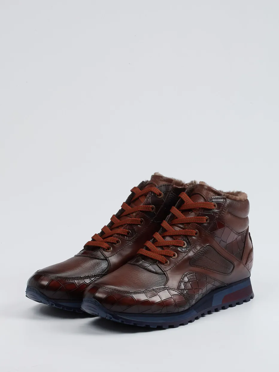 Diese gefütterten Schnürboots kombinieren glänzendes Kalbleder mit markanter Krokoprägung und sorgen durch die profilierte Sohle auch bei Winterwetter für sicheren Halt.