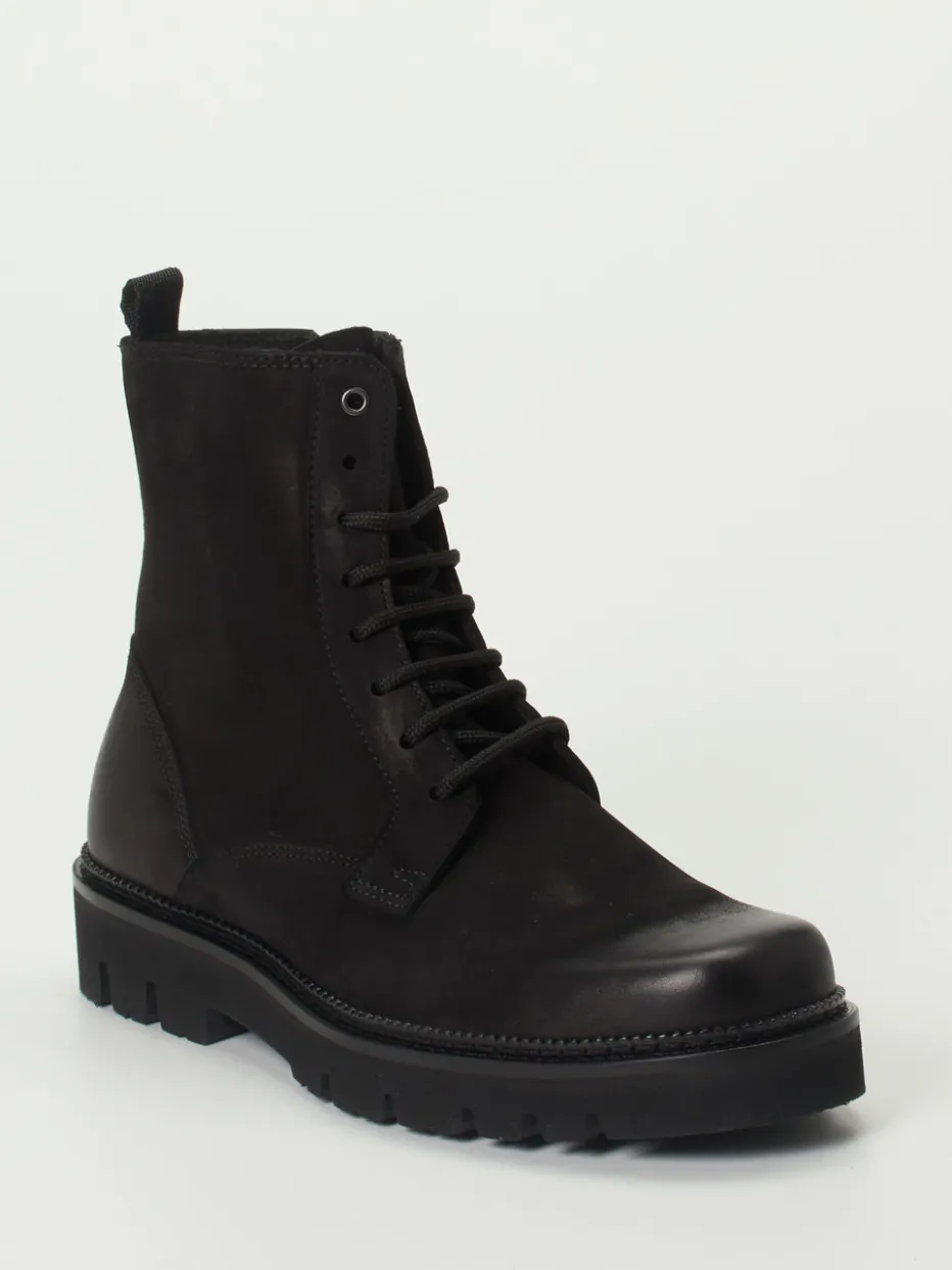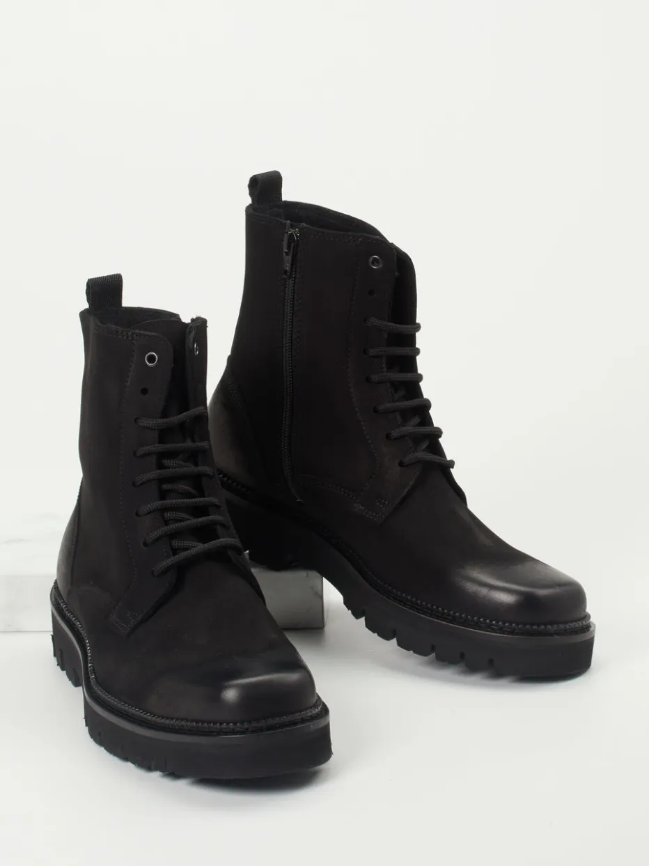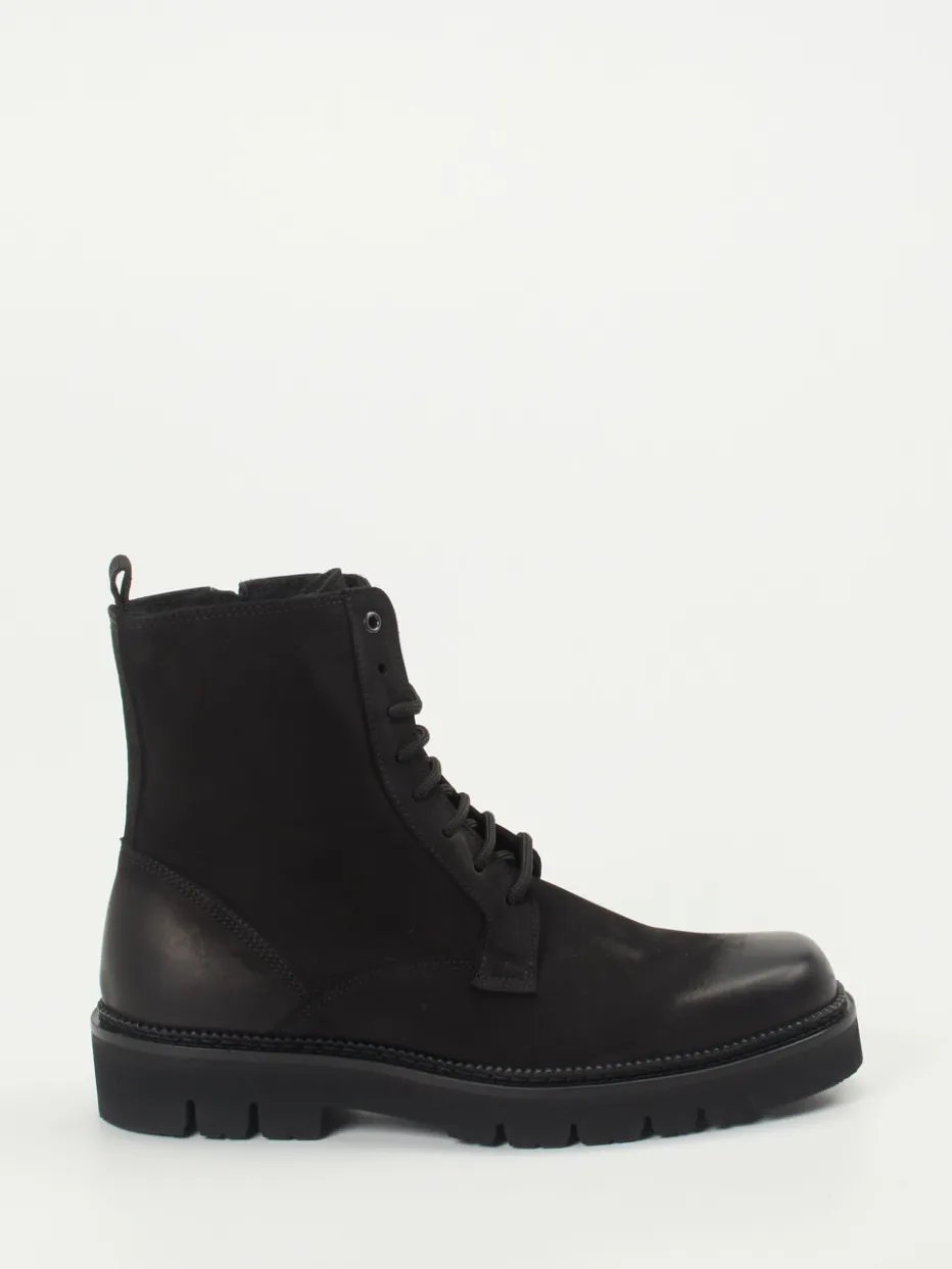 Ideal für nasskalte Herbsttage in der City oder auf herbstlichen Spaziergängen. Schwarzes Nubukleder mit samtig angeschliffener Oberfläche und patinierten Partien an Spitze und Ferse kombiniert Langlebigkeit mit Style. Der hohe Schaft wird durch Schnürung und einen seitlichen Reißverschluss ergänzt, was An- und Ausziehen erleichtert. Die profilierte Gummisohle sorgt für sicheren Halt, das warme Textilfutter für angenehmen Tragekomfort. Eine textile Zuglasche an der Ferse rundet das Design funktional ab.