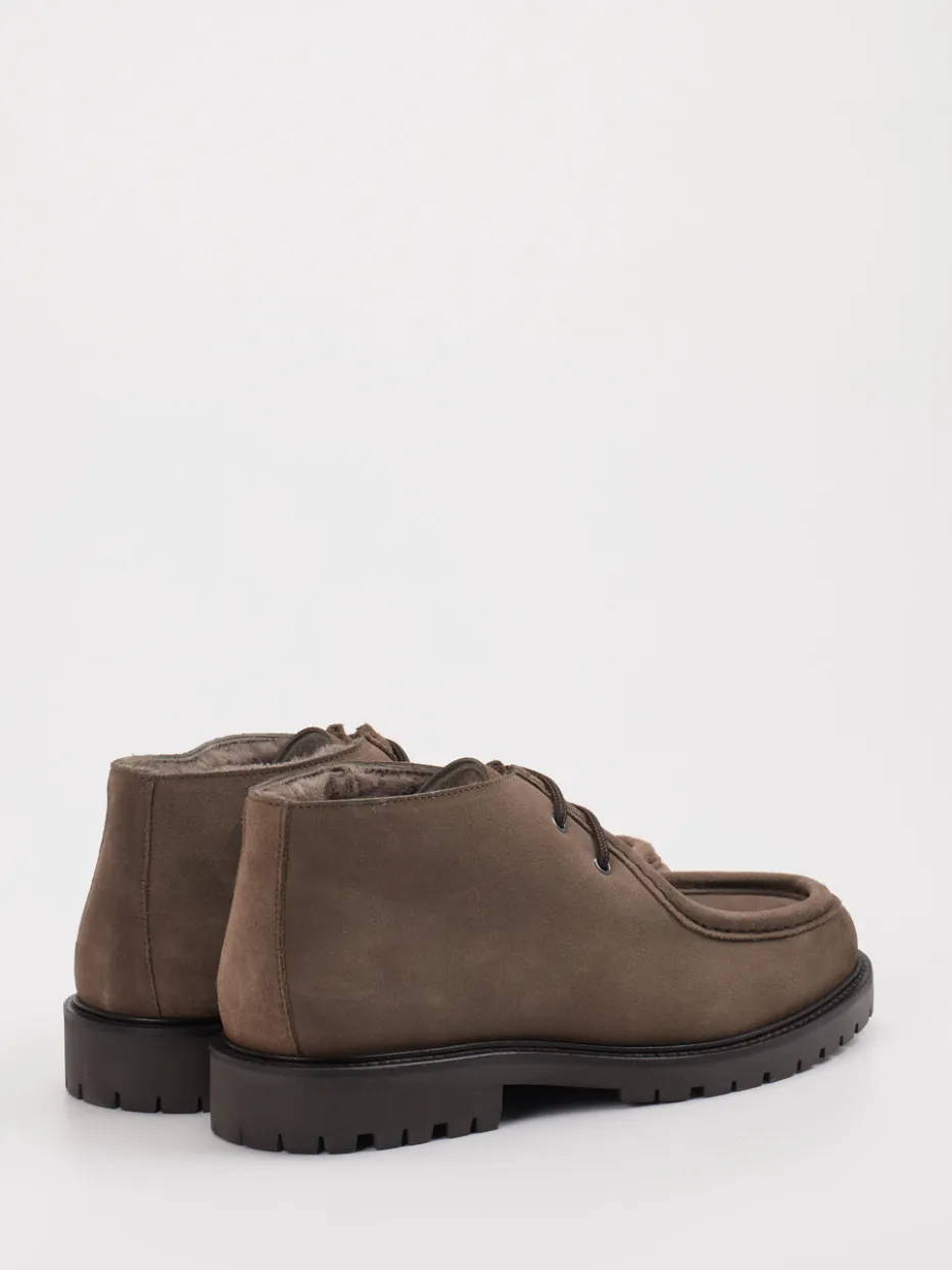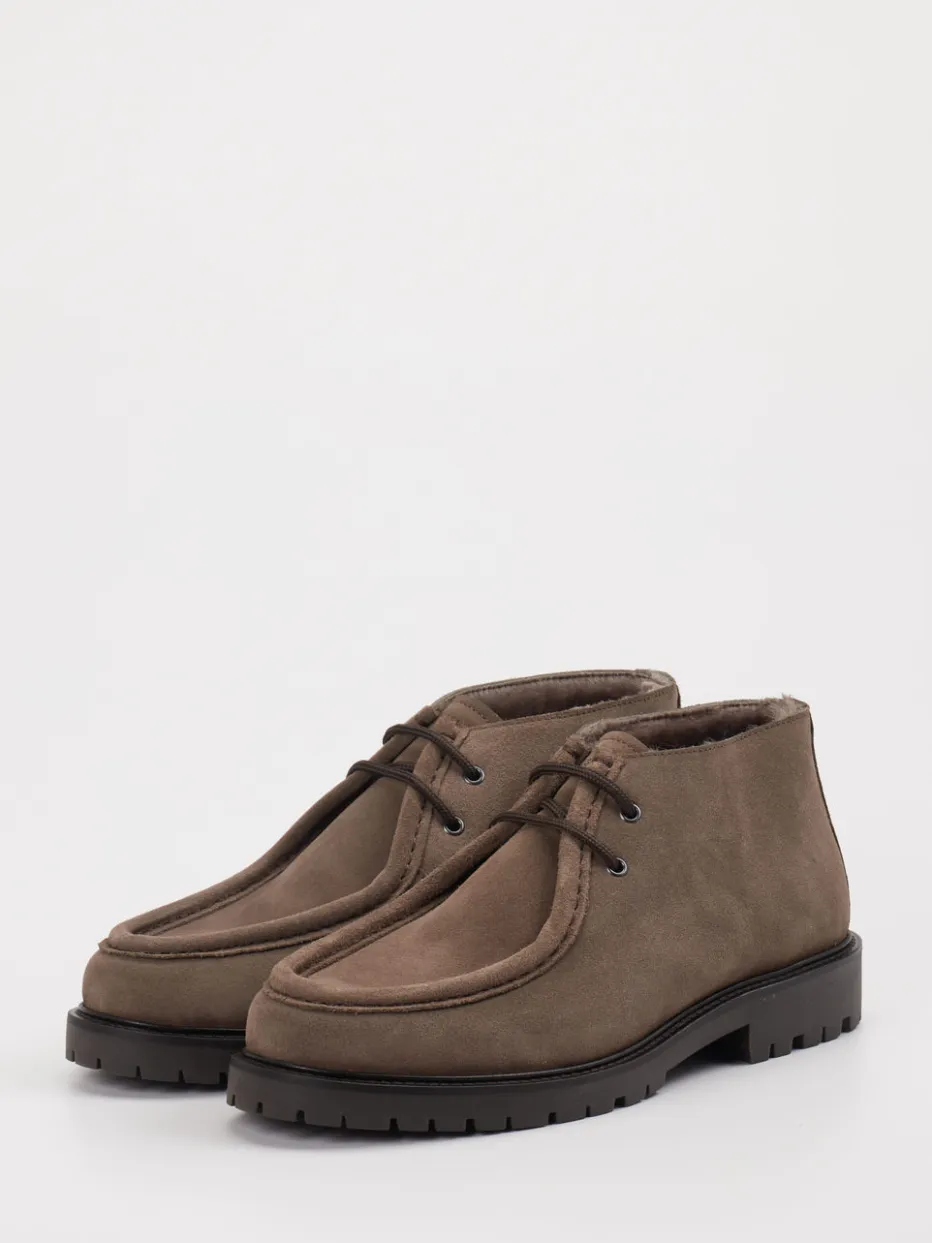 Mit Veloursleder und warmem Lammfellfutter bietet dieser gefütterte Boot stilvolle Robustheit für kühle Tage – ideal für minimalistisch inspirierte Winterlooks.
