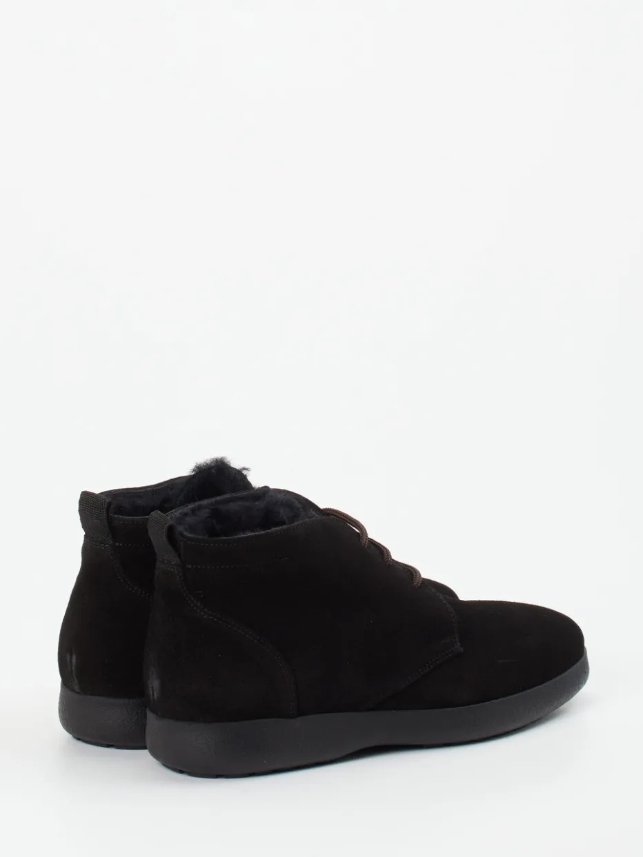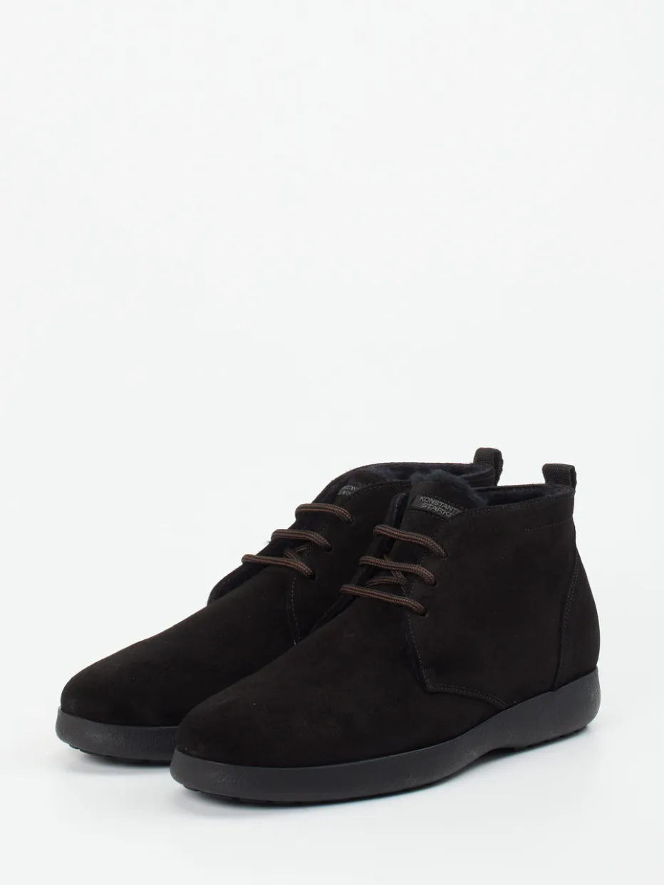 Schlichte Wärme für kalte Tage.Konstantin Starke präsentiert mit diesen Schnürboots eine elegant-lässige Interpretation klassischer Desert Boots. Für Spaziergänge an frostigen Tagen oder entspannte Outdoor-Momente bietet das Modell funktionellen Komfort: Hochwertiges Veloursleder, samtig angeschliffen, trifft auf ein wärmendes Lammfellfutter. Die tiefschwarze Farbe betont die klare Silhouette mit rund zulaufender Form und knöchelhohem Schaft. Ton-in-Ton-Nähte, eine textile Zuglasche und eine stabile Gummisohle mit rutschfestem Profil unterstreichen den zurückhaltenden Charakter. Der Stil ist geprägt von Minimalismus und passt ideal zur Soft Utility-Ästhetik der Saison. Besonders harmonisch wirkt das Paar zu Thermohosen oder klassisch geschnittenen Outdoorjacken. Souveräne Herbst-/Winterbegleiter mit souveränem Komfortanspruch und dezentem Stilprofil.