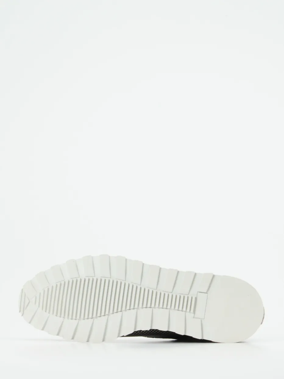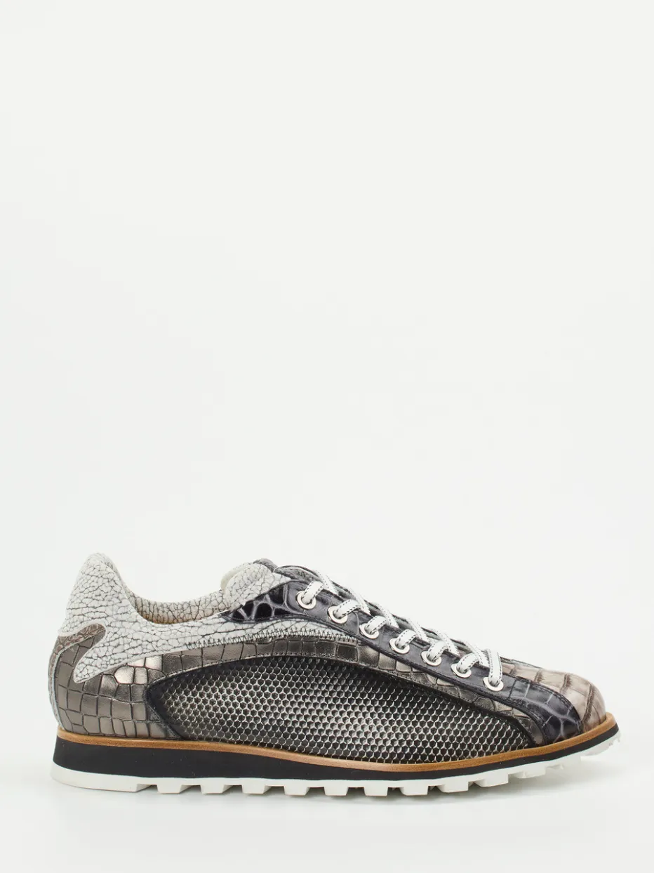 Dieser Sneaker vereint glänzend strukturiertes Kroko-Leder mit Mesh und sorgt durch kontrastreiche Details für einen expressiven Auftritt. Ideal für stilbewusste Freizeitlooks.