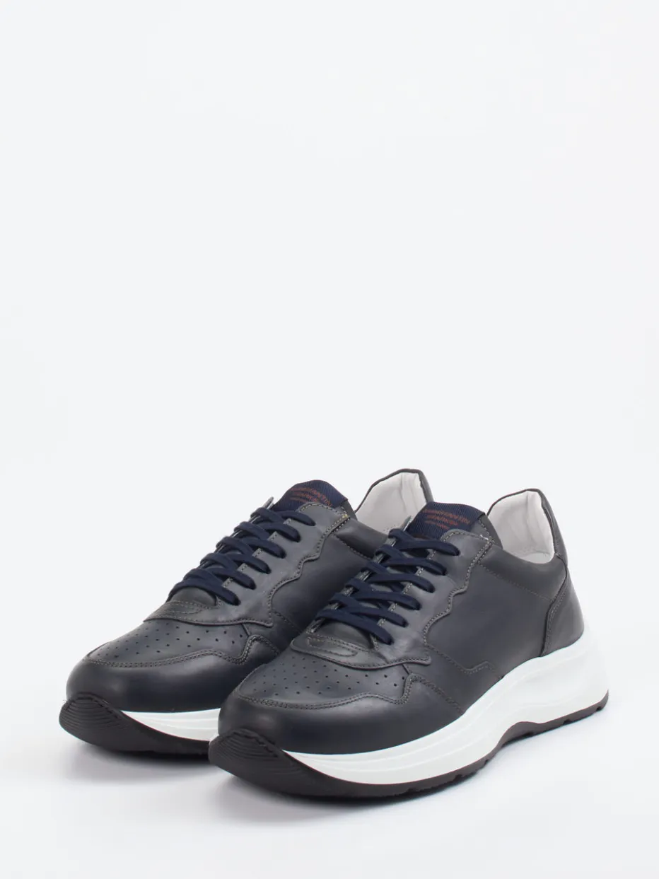 Ideal für urbane Alltagsroutinen verbindet das Modell navyblaues Kalbleder mit matter Oberfläche und einer besonders abriebfesten Gummisohle. Beige Kontrastnähte, dezente Perforationen an der Zehenbox und die klar abgerundete Silhouette unterstreichen die minimalistische Linienführung. Die Frottee-Innensohle mit Wechselfußbett sorgt für atmungsaktiven Tragekomfort. Inspiriert von aktuellen „Quiet Luxury“- und „Chunky“-Trends lässt sich der Sneaker vielseitig kombinieren – etwa zur Chino oder gepflegten Jeans.