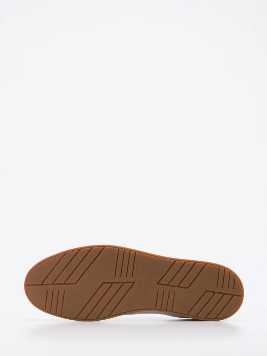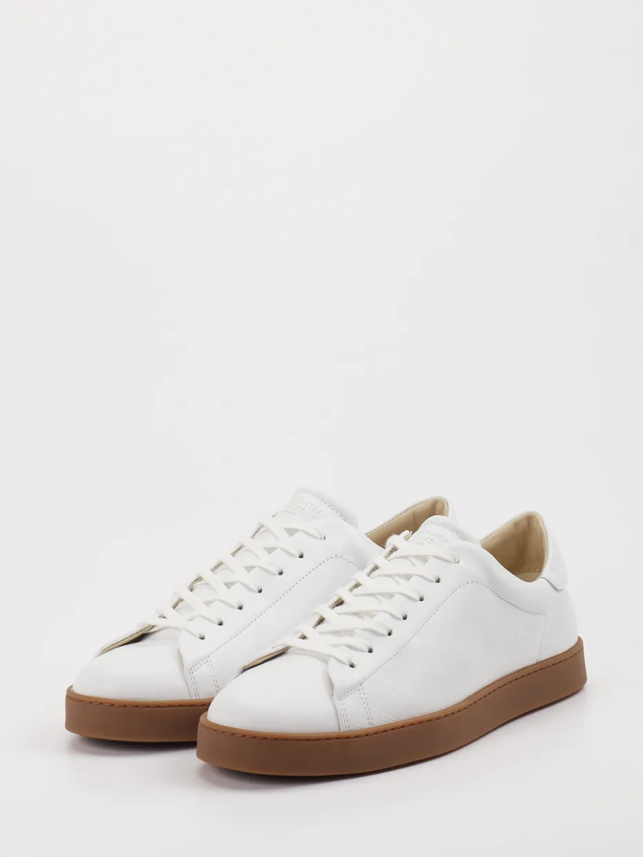 Wenn klare Linien gefragt sind – ob im Büro oder in der Freizeit –, sorgt dieser weiße Low-Top-Sneaker für einen souveränen Auftritt. Aus glattem Kalbleder gefertigt, kombiniert er minimalistisches Design mit edlem Material. Tonale Nähte und eine braune Kontrastgummisohle unterstreichen seine urbane Silhouette. Der klassische Schnürverschluss bietet sicheren Halt, das ledergefütterte Innere ein angenehmes Tragegefühl. Als Teil der ‚Quiet Luxury‘-Bewegung passt er perfekt zu monochromen Looks.