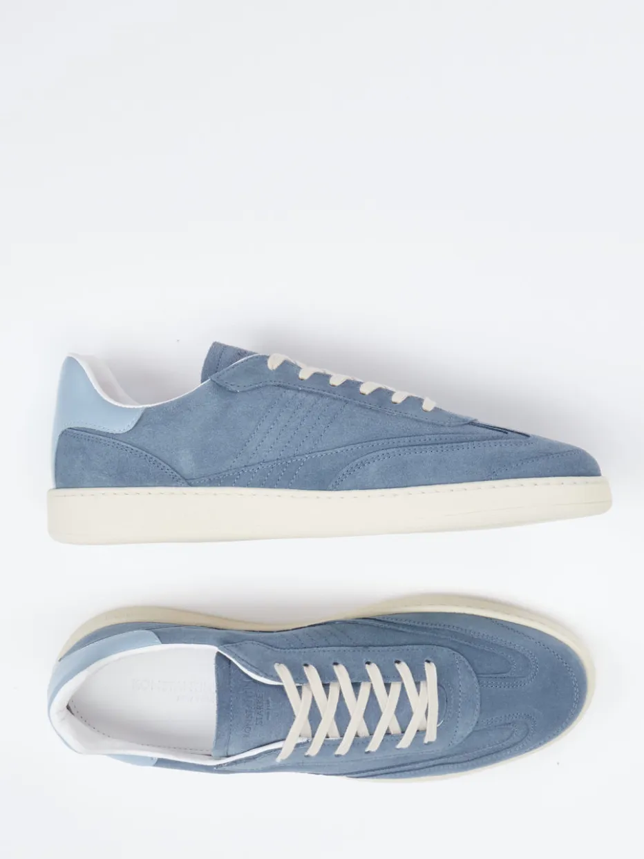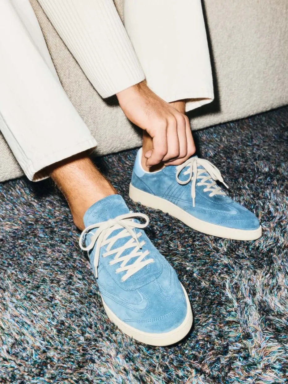 Für sommerliche City-Tage, bei denen Komfort und Stil gefragt sind: Das hochwertige Veloursleder in sattem Jeansblau wirkt durch seine matt-weiche Oberfläche besonders edel. Die Fersenpartie aus hellblauem Glattleder setzt einen subtilen Akzent, während feine Ziernähte und eine doppelte Flügelkappe den Retro-Look unterstreichen. Die cremefarbene Gummisohle mit dezentem Fischgrät-Profil ergänzt das harmonische Gesamtbild. Passt besonders gut zu hellen Chinos und casual Knitwear.