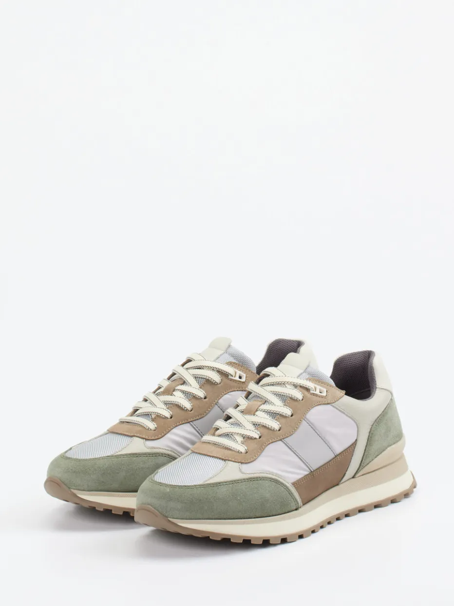 Ideal für urbane Freizeitlooks und entspannte Outdoor-Momente: Der Unisex-Sneaker ist aus feinem Veloursleder gefertigt, ergänzt durch samtig strukturiertes Mesh und glattes Glattleder. Das Design in Cremeweiß, Salbeigrün und Taupebraun wirkt harmonisch und liegt farblich ganz im Trend der „Muted Earth Tones SS24“. Die zweifarbige Schnürung und die verstärkte Ferse akzentuieren die sportliche Low-Cut-Silhouette. Dank griffiger Profilsohle und gepolstertem Wechselfußbett überzeugt das Modell auch funktional auf ganzer Linie.