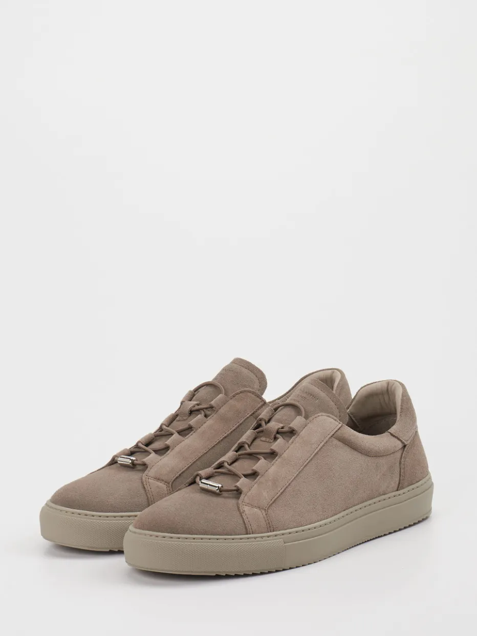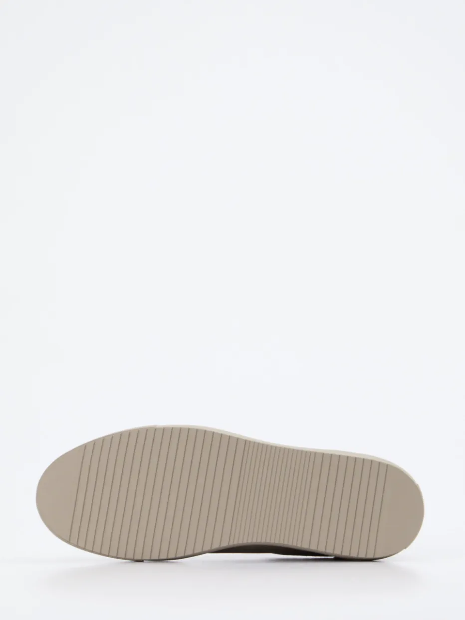 Die flach gehaltene Silhouette trifft auf weiches Veloursleder in edlem Taupe. Details wie eine elastische Schnürung mit metallischen Enden und eine tonale Nahtführung unterstreichen die cleane Optik. Die matt-texturierte Oberfläche, die komfortable Gummisohle und der gepolsterte Schaftrand bieten Alltagskomfort zwischen Büro und Freizeit. Der Trend „Quiet Luxury“ spiegelt sich in der monochromen Zurückhaltung und feinen Verarbeitung wider. Lässt sich hervorragend zu hellen Denims und Blousons in Naturtönen kombinieren.