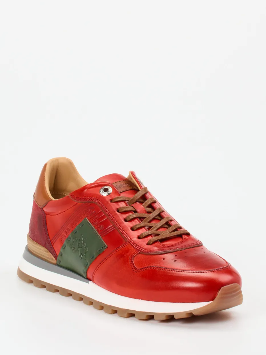 Ein markanter Retro-Runner aus hochwertigem Kalbleder – das raffinierte Color-Blocking in Rot, Olivgrün und Cognac verleiht ihm modische Tiefe. Perfekt für urbane Looks mit Vintage-Twist.