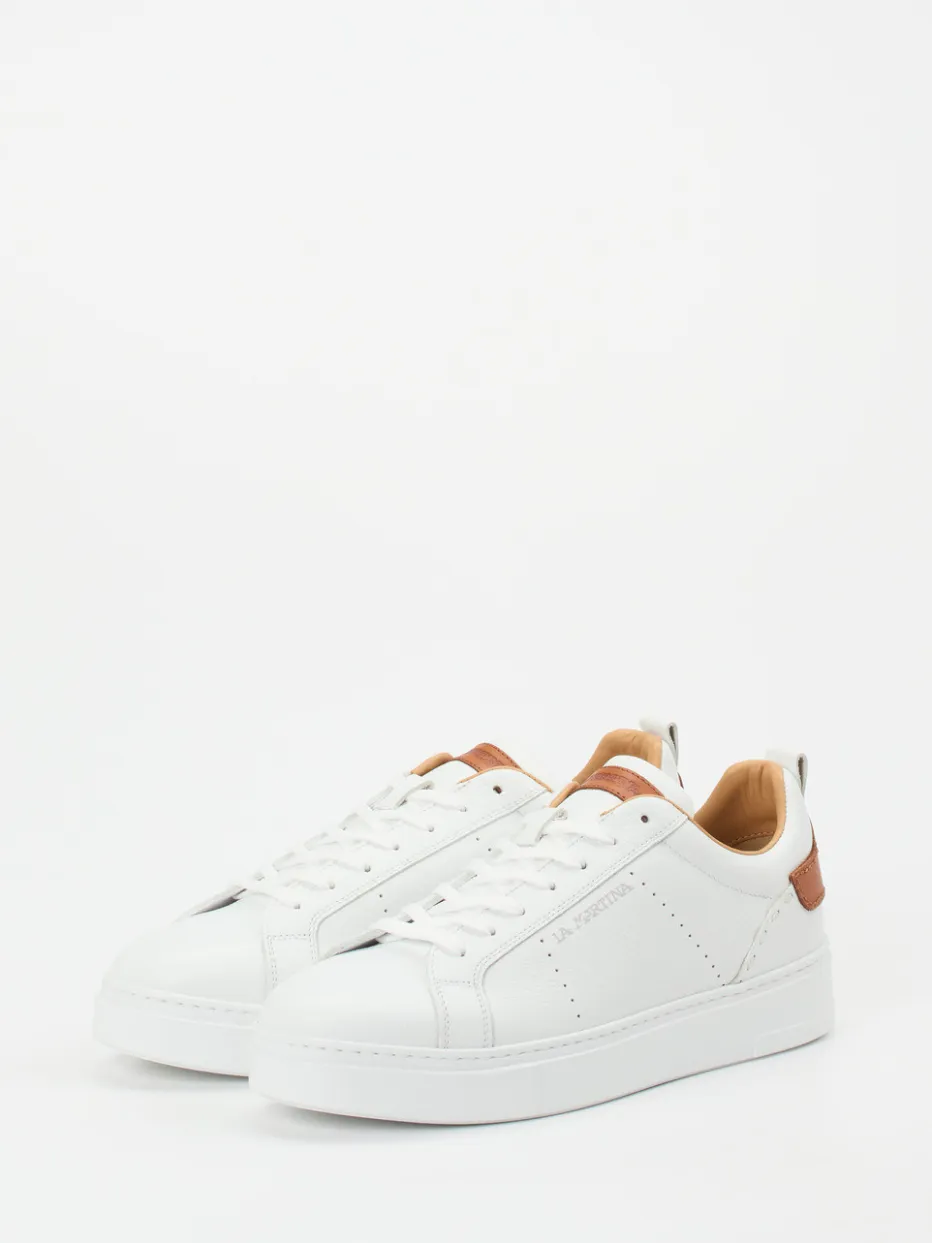 Reduziert aufs Wesentliche.La Martina präsentiert mit diesem Sneaker ein Modell für Herren, das den Clean-Look konsequent umsetzt. Ideal für Alltag und Büro bringt der Low-Top-Sneaker eine hochwertige Kombination aus feinnarbigem Kalbleder und atmungsaktivem Meshfutter. Das Weiß wird durch cognacfarbene Lederdetails an Zunge und Ferse stilvoll akzentuiert. Die klassische, rund geformte Silhouette mit Schnürung und stabiler Fersenkappe sorgt für Komfort und Struktur. Das feine Rillenprofil der Gummisohle unterstreicht die Funktionalität. Passt zum modernen „Quiet Luxury“-Trend und zu minimalistischen Outfits. La Martina vereint Understatement mit Premiumanspruch für dezente Eleganz im Alltag.