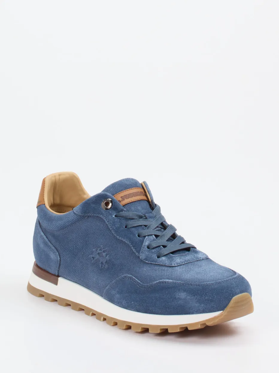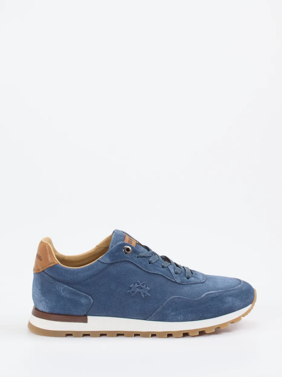 Stilvoll unterwegs mit Vintage-Charme.La Martina präsentiert einen Herren-Sneaker, der Retro-Running-Stil neu interpretiert. Ideal für urbane Alltagsmomente vereint dieses Modell jeansblaues Kalbleder mit samtigem Velours-Finish und Canvas-Elementen. Charakteristisch ist die klassische Runner-Silhouette mit cognacfarbenem Fersenpatch in Handnaht-Optik. Die seitliche Logoprägung unterstreicht den Markencharakter, während Schnürung und profilierte Gummisohle Tragekomfort und Bodenhaftung sichern. Kontrastfarben und die stark strukturierte Außensohle greifen moderne Streetwear-Einflüsse auf. Perfekt kombinierbar zu Slim Jeans und leichtem Blouson – markentypischer Komfort in ikonischem Design.