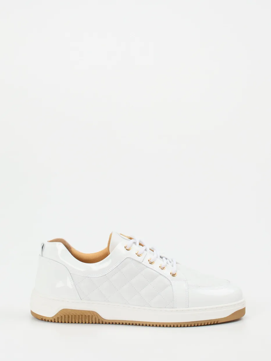 Luxus-Update für den minimalistischen Look.Leandro Lopes interpretiert den Herren-Sneaker neu: sportlich, edel und klar im Design. In Alltagssituationen mit urbanem Anspruch bietet dieses Modell aus weißem, glänzendem Kalbleder samt gesteppten Partien und goldenen Details einen stilvollen Auftritt. Die klassische, sportliche Silhouette wird durch goldfarbene Metallösen und eine schlichte Gummisohle mit fein strukturiertem Profil akzentuiert. Das Innenfutter aus Textil sowie das herausnehmbare Fußbett sorgen für Komfort, auch an langen Tagen. Perfekt kombiniert mit heller Stoffhose und hellbrauner Bomberjacke. Ein clean-luxuriöser Begleiter für trendbewusste Citystyles.