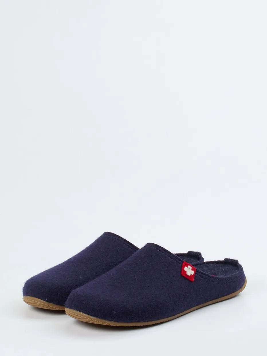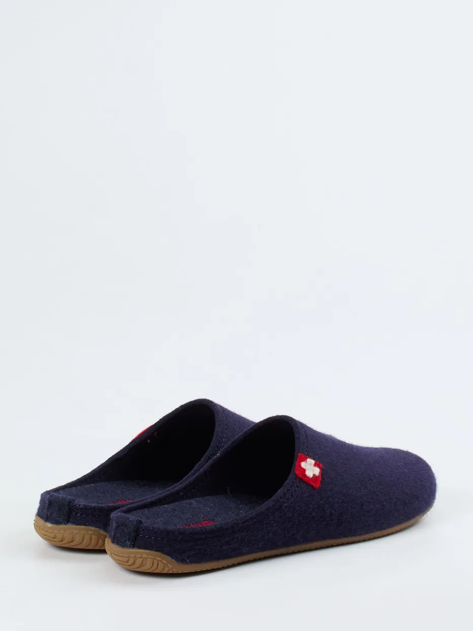 Wohlig warm im natürlichen Stil.Living Kitzbühel präsentiert diese dunkelblauen Hausschuhe aus feinem Wollfilz. Perfekt für kalte Böden und ruhige Stunden: Das samtig matte Obermaterial aus natürlicher Wolle sorgt für behagliche Wärme, während die flache Clog-Form einen schnellen Einstieg erlaubt. Das rot-weiße Kreuz-Emblem setzt einen charmanten Akzent im alpeninspirierten Look. Mit flexibler, rutschhemmender Gummisohle ausgestattet, bleiben Schritt und Stand auch auf glatten Untergründen sicher. Minimalistisch im Stil und funktional durchdacht, fügen sie sich ideal in die Slow-Living-Ästhetik ein. Komfort und Langlebigkeit machen dieses Modell zu einem nachhaltigen Wohnfavoriten.