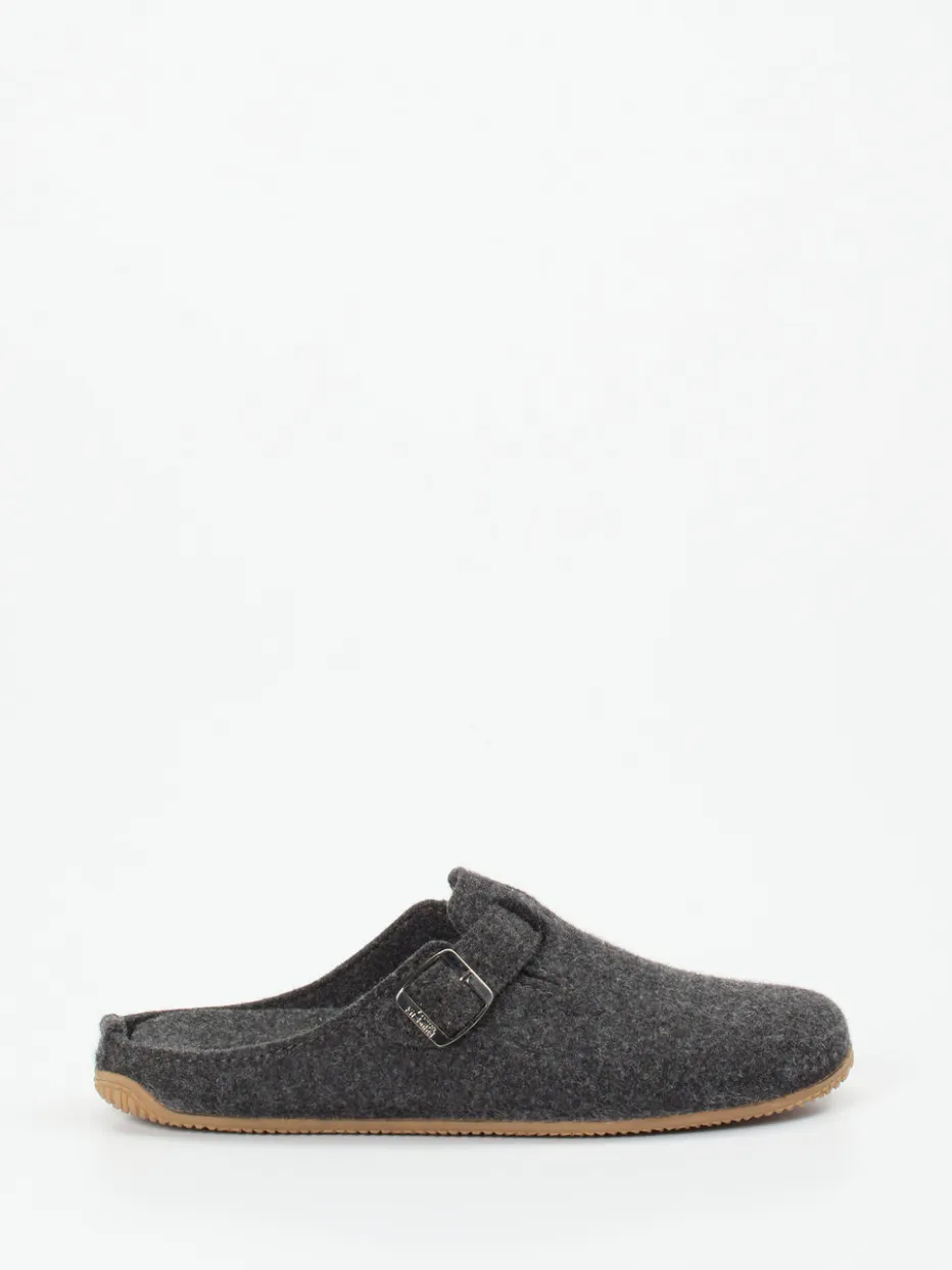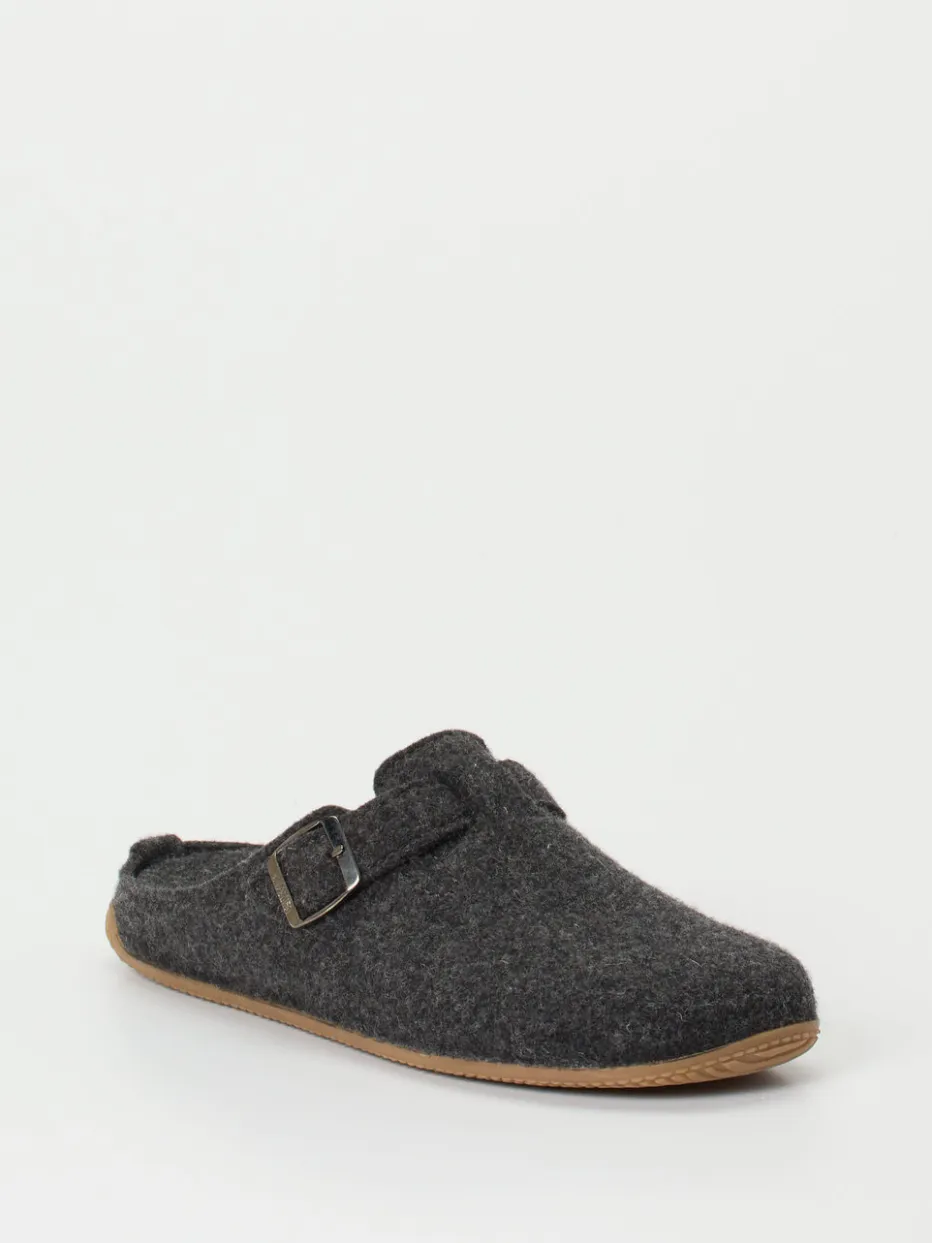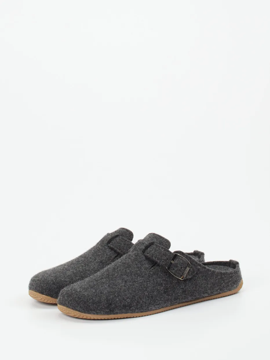 Gemütlichkeit mit alpinem Charakter.Living Kitzbühel präsentiert einen Unisex-Pantoffel in Clog-Optik für entspannte Innenmomente. Die geschlossene Vorderpartie mit offener Ferse bietet unkomplizierten Komfort für das heimische Umfeld. Gefertigt aus warmem Filz mit melierter Oberfläche und gestaltet in tiefem Anthrazit, vermittelt das Modell dezente Eleganz mit funktionalem Anspruch. Die verstellbare Metallschnalle mit eingeprägtem Logo setzt einen markanten Akzent, während die profilierte Gummisohle für Trittsicherheit auf glatten Böden sorgt. Inspiriert vom „Natural Comfort“-Trend passt das Design perfekt zu entspannten Freizeit-Looks und harmoniert ideal mit gemütlicher Homewear. Markentypischer Tragekomfort in hochwertiger Verarbeitung – made for moments of ease.