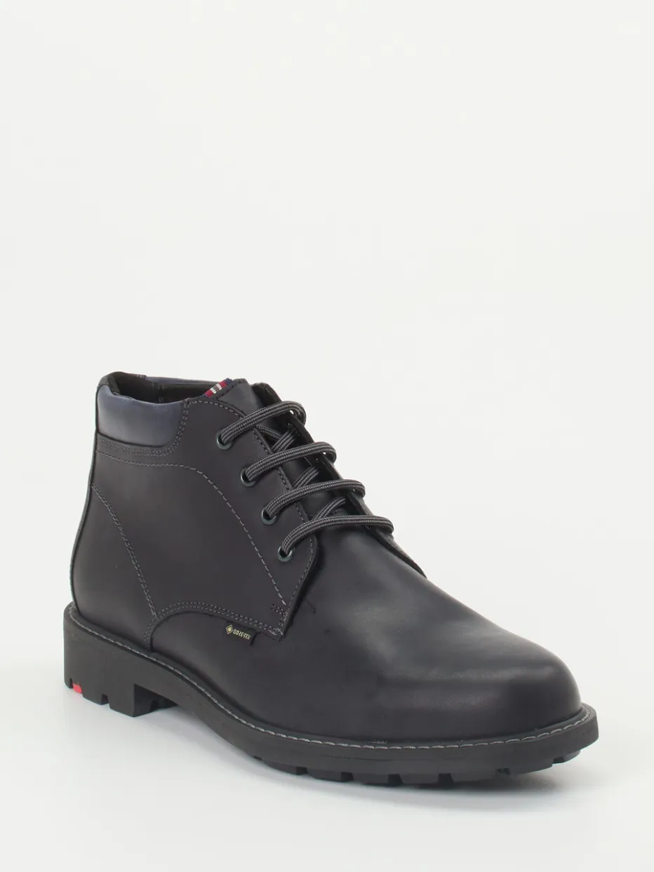 Wenn es draußen nass und windig ist, punktet dieses Modell mit seinem wind- und wasserdichten Glattleder in mattem Schwarz, ergänzt durch eine integrierte GORE-TEX-Membran. Die knöchelhohe Silhouette zeigt sich schnörkellos und betont durch tonale Ziernähte sowie ein dezentes Label. Innen sorgt ein wärmendes Lammfellfutter für Komfort, außen gewährleistet eine kräftig profilierte Gummisohle Trittsicherheit. Der gepolsterte Schaftrand und die individuelle Schnürung runden die Alltagstauglichkeit ab. Die Kombination aus Funktionalität und urbaner Zurückhaltung passt besonders zu wetterfesten Casual-Looks.