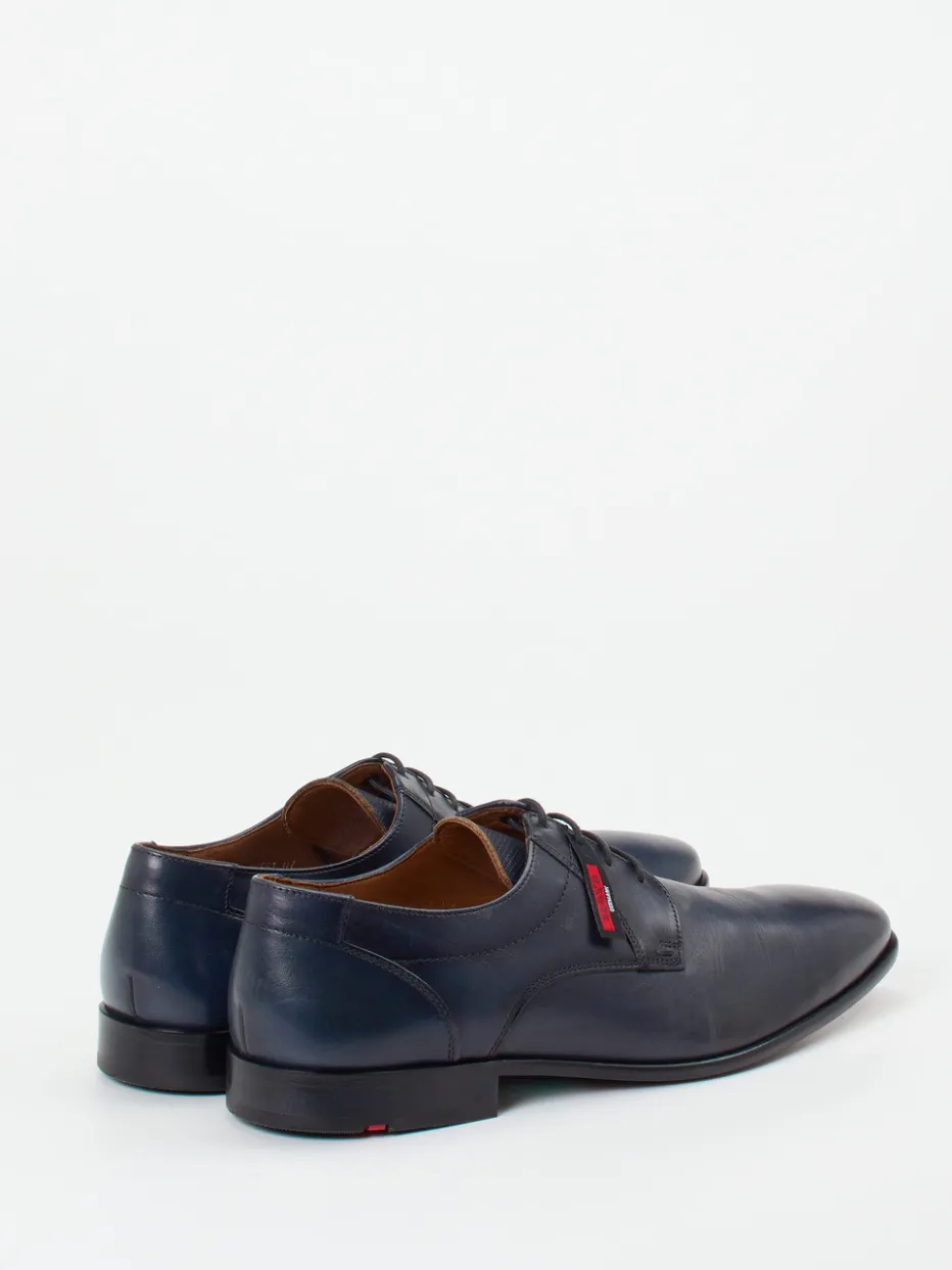 Stilsicher durch den Business-Alltag.Lloyd präsentiert mit diesem Herrenschuh einen klassischen Derbyschnürer in edlem Design. Für formelle Anlässe bietet das glanzvoll verarbeitete Kalbleder in Dunkelblau eine elegante Lösung. Der schmal zulaufende Leisten, die feine Nahtführung und die perforierte Lasche akzentuieren das minimalistische Gesamtbild. Ausgestattet mit Lederlaufsohle, gummiertem Absatz und komfortablem Fußbett überzeugt das Modell auch funktional. Stilistisch fügt es sich ideal in den Trend „Quiet Luxury“ ein und passt zu Businesshose wie Anzug gleichermaßen. Ein überzeugender Auftritt – mit langlebiger Lloyd-Qualität.