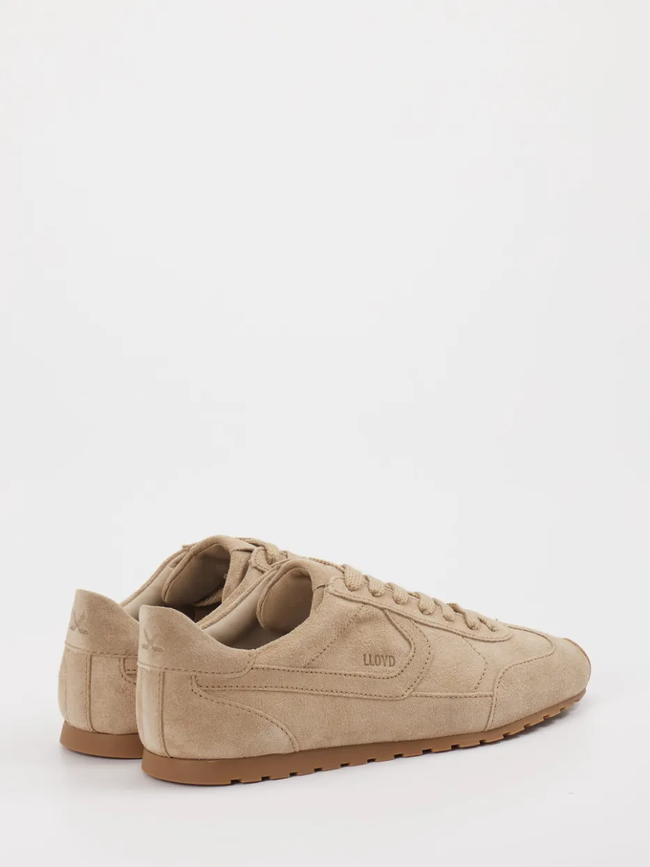 Lloyd präsentiert mit diesem Sneaker ein Herrenmodell im Stil klassischer Retro Runner. Perfekt für entspannte Tage in der Stadt: Das Modell aus beigem Veloursleder vereint matte Oberfläche mit Ton-in-Ton-Nähten und geprägten Logo-Details. Die flach gehaltene, schmal zulaufende Silhouette wird durch eine markante Gummisohle mit griffigem Profil ergänzt. Das Innenfutter aus Leder verspricht Tragekomfort, während die Schnürung sicheren Halt garantiert. Im Look greift der Schuh die Ästhetik der 90er auf – ein dezenter Akzent für lässige Casual- oder Monochrom-Outfits. Stil und Komfort in einem – ein zeitgemäß interpretierter Klassiker aus dem Hause Lloyd.