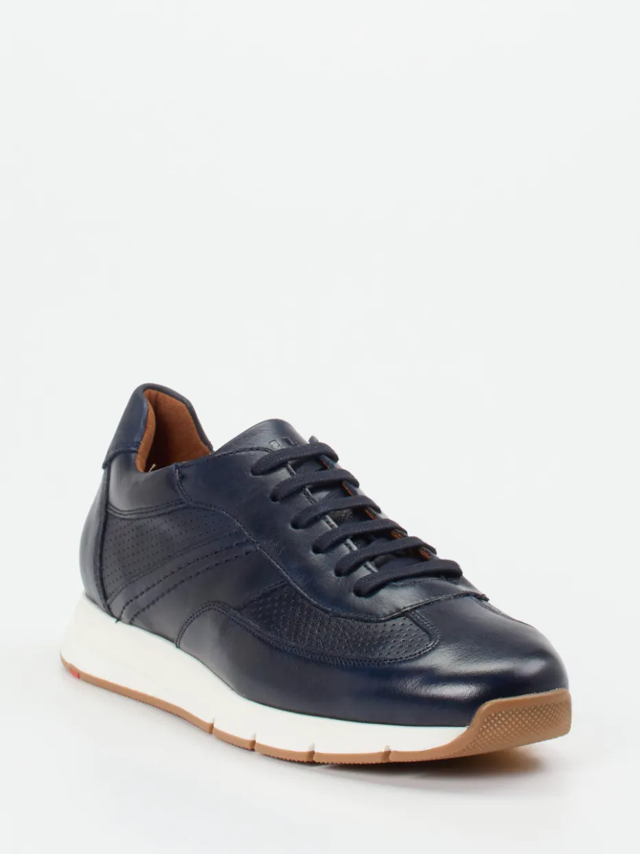 Eleganter Komfort für urbane Looks.Lloyd präsentiert mit diesem Herren-Sneaker ein Modell, das Alltag und Büro stilvoll verbindet. Das glatte, navyblaue Kalbleder mit glänzender Oberfläche und dezent perforierten Einsätzen verleiht dem Schuh eine elegante Struktur. Die klassische Sneakerform wird durch eine helle Gummisohle mit farbigen Akzenten ergänzt, die für sicheren Halt und optische Dynamik sorgt. Ein gepolsterter Schaftrand und ein Wechsel-Fußbett garantieren Tragekomfort auch bei langen Tagen. Der minimalistische Look mit Anleihen an Retro Running Styles passt zum Trendthema „Quiet Luxury“. Ein entschlossener Auftritt mit LLOYD-typischer Qualität und Komfort.