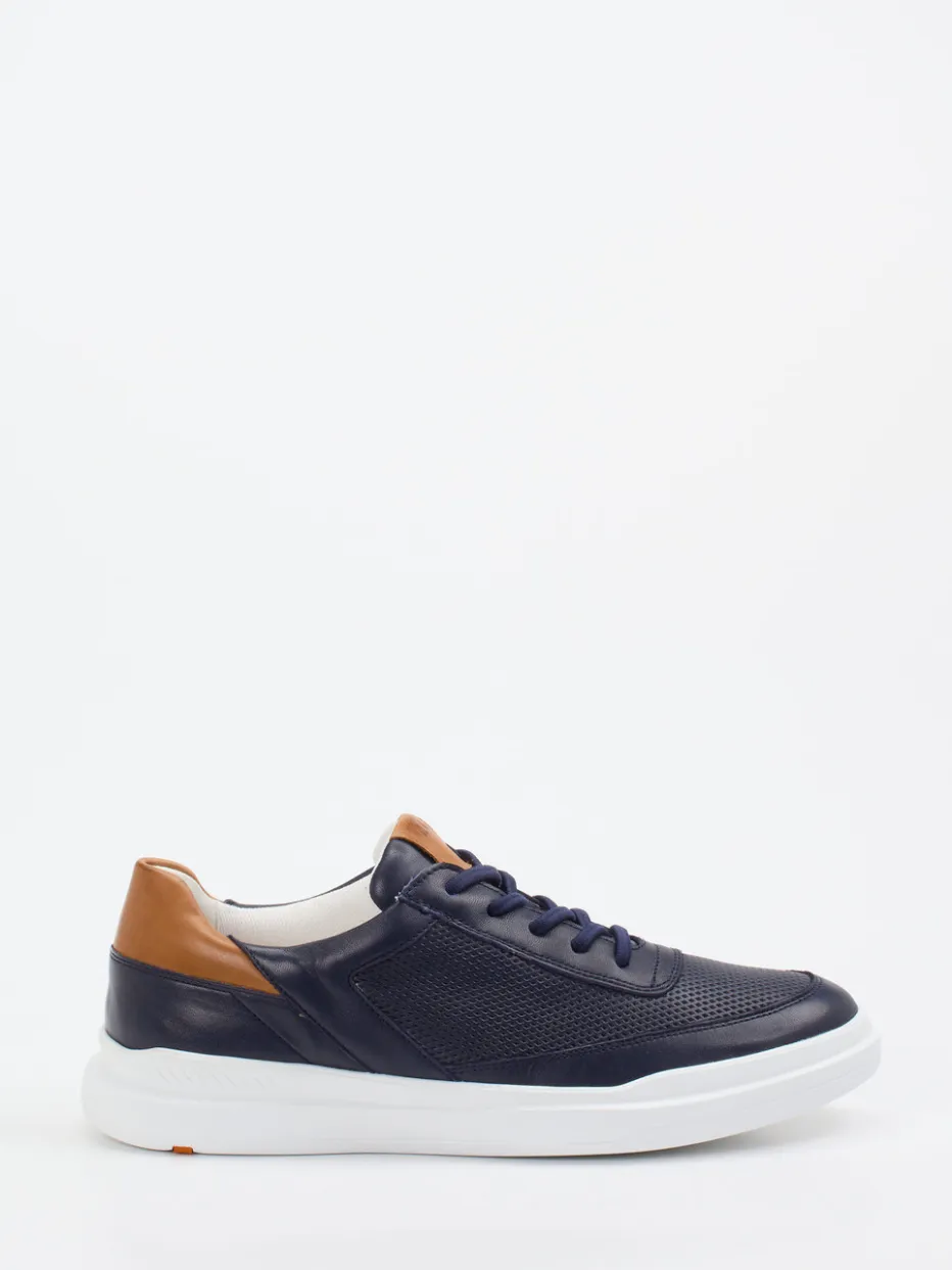 Komfort trifft auf Understatement.Lloyd präsentiert mit diesem Herren-Sneaker eine formstarke Ergänzung für moderne Casual-Outfits. Dank seiner ausgewogenen Low-Top-Form und dem hochwertigen Kalbleder in Dunkelblau bietet dieses Modell maximalen Komfort für Büro und Alltag. Die glatte Oberfläche kombiniert mit einem partiell geprägten Perforationsfeld wirkt klassisch-maskulin, während cognacfarbene Details an Ferse und Zunge sowie die weiße Gummisohle frische Akzente setzen. Der weich gepolsterte Einstieg steigert das Tragegefühl zusätzlich. Im Stil zwischen Minimalismus und Modern Heritage gehalten, eignet sich der Sneaker ideal zu Chino oder Denim. Ein Lederschuh mit Komfortversprechen und subtiler Designlinie – ganz im Stil von Lloyd.