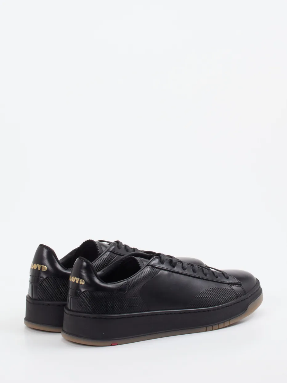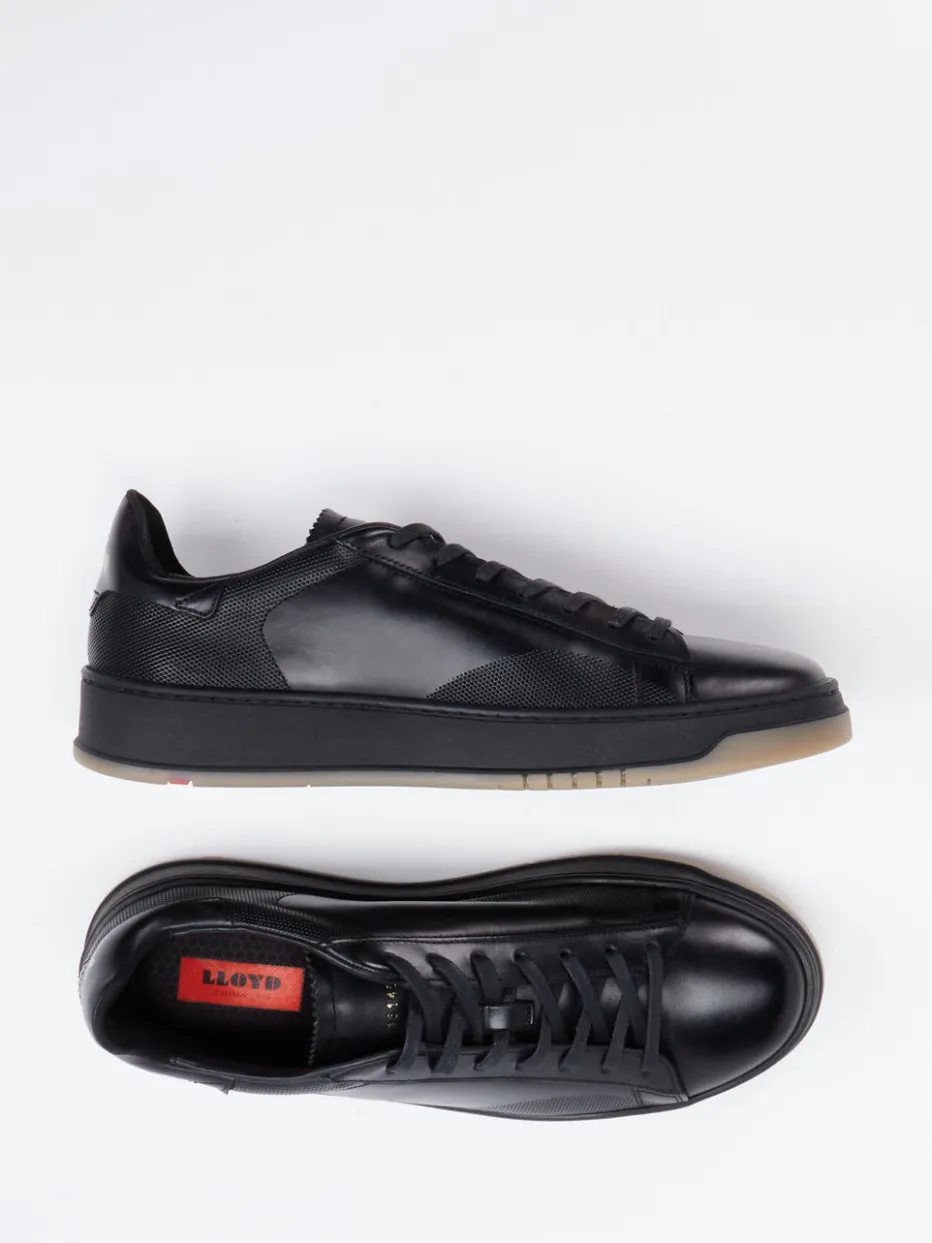 Minimalistisch trifft auf modern.Der Herren-Sneaker von Lloyd vereint klare Linienführung mit Premium-Qualitäten. Für elegante Alltagslooks oder entspanntes Büro-Outfit bietet er mit geschmeidigem Kalbleder und strukturierten Mesh-Einsätzen einen ausbalancierten Materialmix. Das schwarze Obermaterial wirkt durch dezente braunbeige Akzente und goldfarbenes Fersenlogo edel zurückhaltend. Eine profilierte Gummisohle mit rotem Markenstreifen sorgt für Trittsicherheit, das herausnehmbare Memory-Foam-Fußbett für Komfort. Die klassische Low-Top-Form mit Schnürung komplettiert das minimalistische Designkonzept. Wertige Texturkontraste und urbaner Purismus – typisch Lloyd.