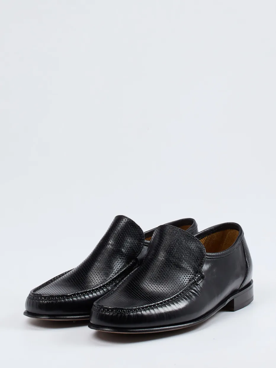 Dieser Loafer aus schwarzem Känguruleder überzeugt mit hochwertiger Verarbeitung, perforiertem Vorderblatt und klassischer Linienführung – eine stilvolle Wahl für Business und feierliche Anlässe.