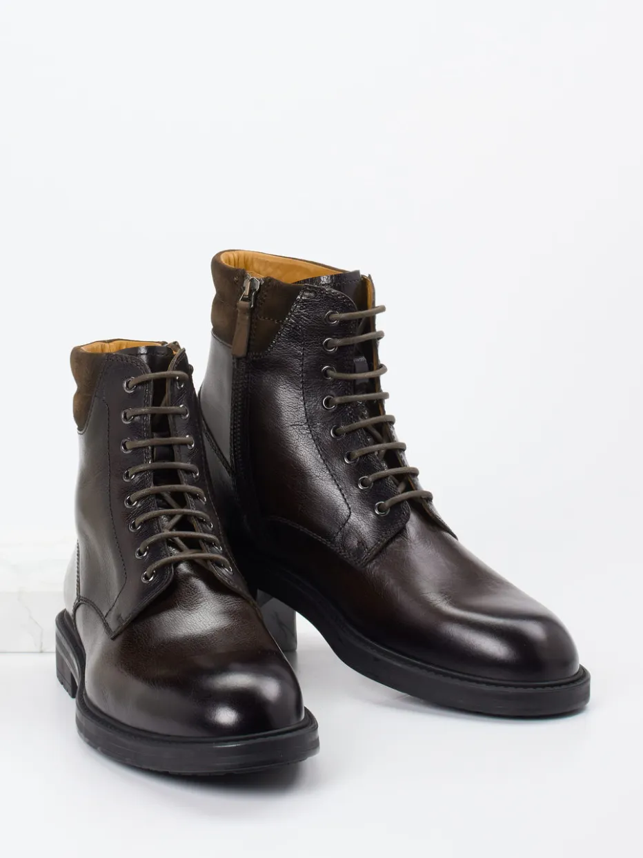 Stilsicher durch kühle Tage.Die Marke Magnanni präsentiert diese klassische Herren-Schnürstiefelette. Für wechselhafte Herbst- und Wintertage bietet das Modell zuverlässigen Komfort und stilvolle Zurückhaltung. Das verwendete Kalbleder zeigt sich in facettenreichem Dunkelbraun mit glänzender Oberfläche und ergänzt sich optisch mit einem weich strukturierten Velourslederschaft. Ein seitlicher Reißverschluss erleichtert den Einstieg, während die markante Profilgummisohle Trittsicherheit verspricht. Schnürung mit Metallösen und Ton-in-Ton-Nähte runden das Design im Geist von „Quiet Luxury“ ab. Perfekt kombinierbar mit Kaschmir, Wolle und strukturierten Materialien. Ein durchdachter Begleiter für maskuline Eleganz mit funktionalem Anspruch.