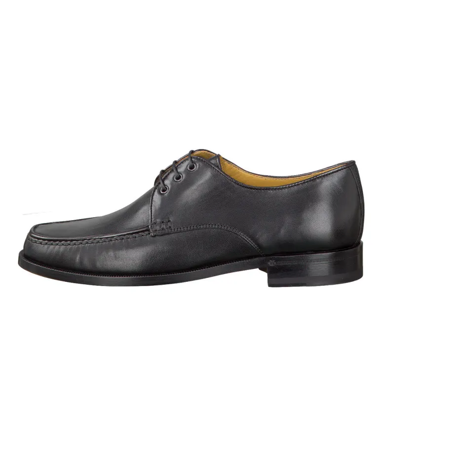 Schwarz und stilvoll zugleich.Mannori interpretiert den klassischen Herren-Schnürschuh als eleganten Derby mit handwerklichem Feinsinn. Für stilbewusste Business-Tage oder formelle Anlässe bietet dieser Derbyschuh aus schwarzem, glänzendem Ziegenleder überzeugende Qualität. Die leicht eckige Vorderpartie, dezente Ton-in-Ton-Nähte und das beigefarbene Innenfutter runden das puristische Design ab. Mit hochwertiger Ledersohle, rahmengenähter Konstruktion und handgefertigter Verarbeitung aus Italien steht er für höchste Ansprüche in Materialien und Stil. Der Schnürverschluss mit vier Ösen betont die klassische Linie. Ideal kombinierbar mit Anzug oder schmaler Stoffhose. Ein Schuh für kompromisslose Ästhetik und handwerkliche Exzellenz.