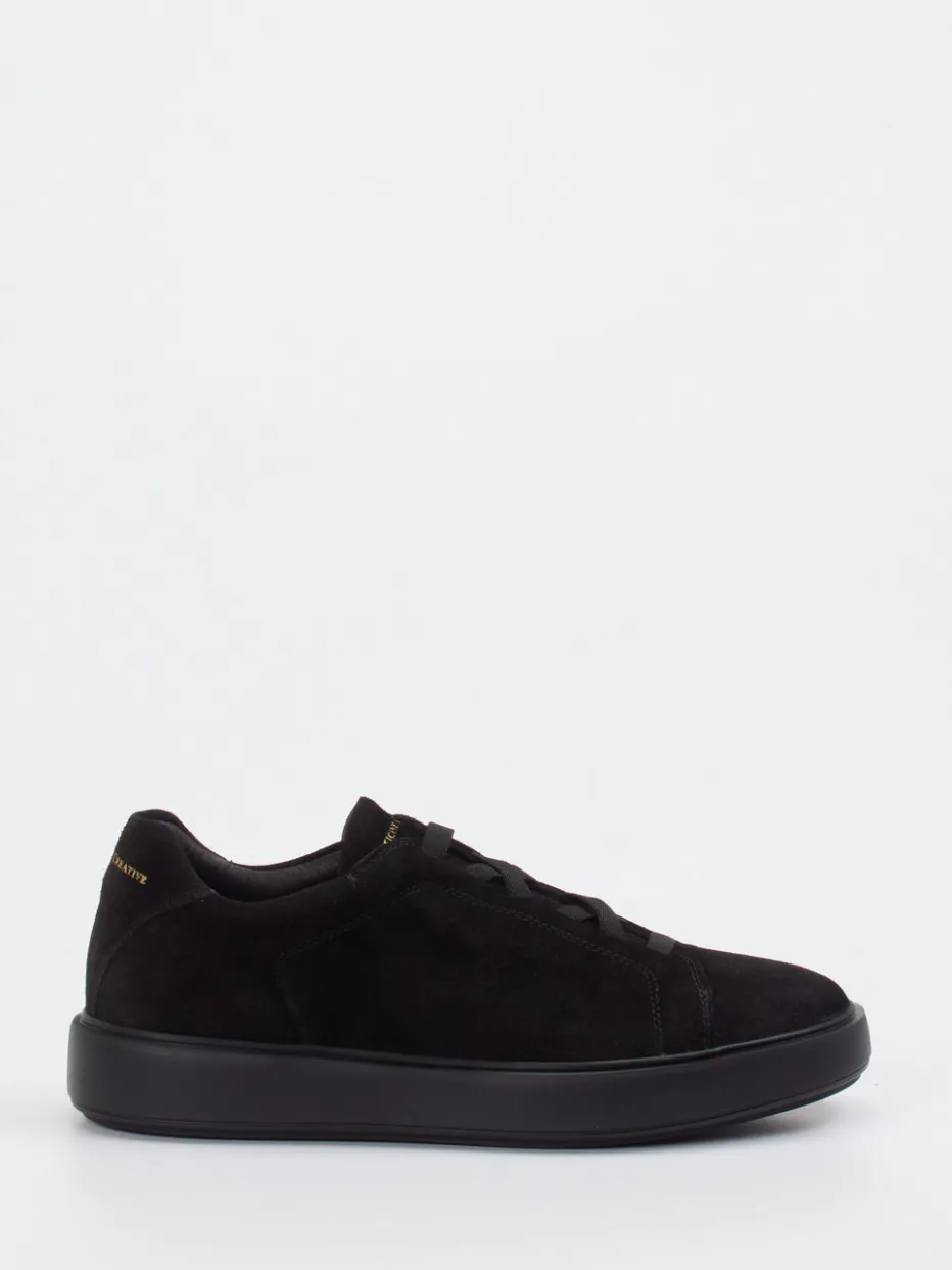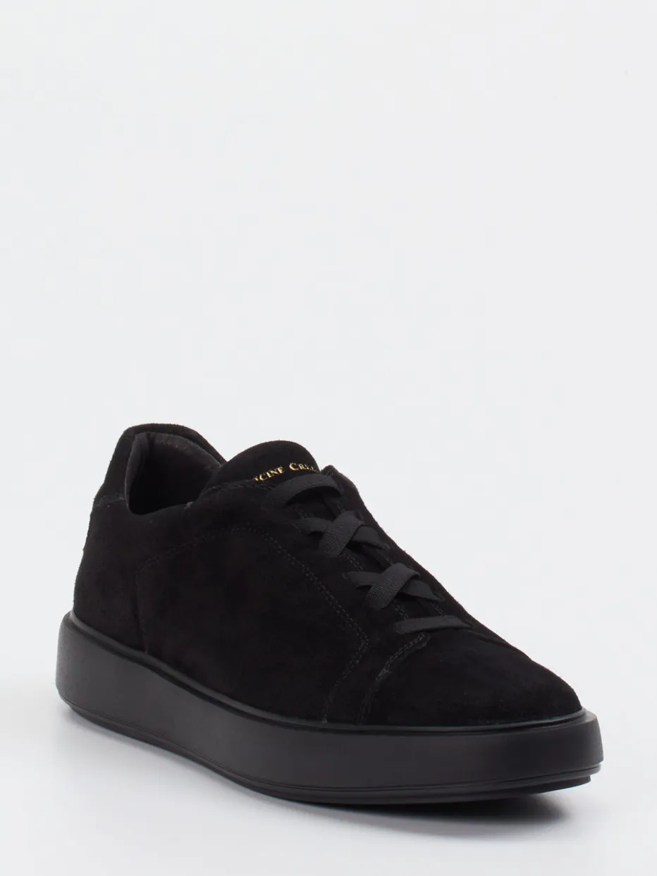 Monochromer Luxus für moderne Alltage.Officine Creative interpretiert den klassischen Herren-Sneaker neu. Dieser Low-Top-Sneaker aus hochwertigem, samtig angeschliffenem Veloursleder in tiefem Schwarz überzeugt durch seine klare, abgerundete Silhouette. Eine tonale Gummisohle verleiht dem Modell alltagstauglichen Komfort, während goldfarbene Prägungen an Zunge und Ferse dezente Luxusakzente setzen. Die gepolsterte Partie rund um den Einstieg sorgt für ein angenehmes Tragegefühl. Im Stil des „Quiet Luxury“ fügt sich das Design nahtlos in minimalistische und klassische Looks ein – besonders in Kombination mit cleanen Business-Outfits oder smarten Alltagsstyles. Ein Schuh mit subtiler Raffinesse und markentypischer Verarbeitungsqualität.