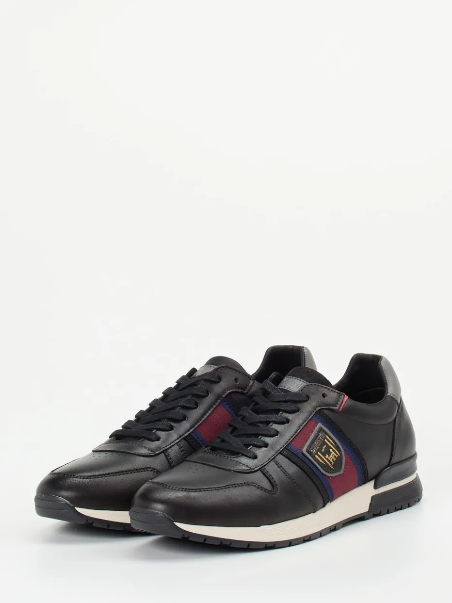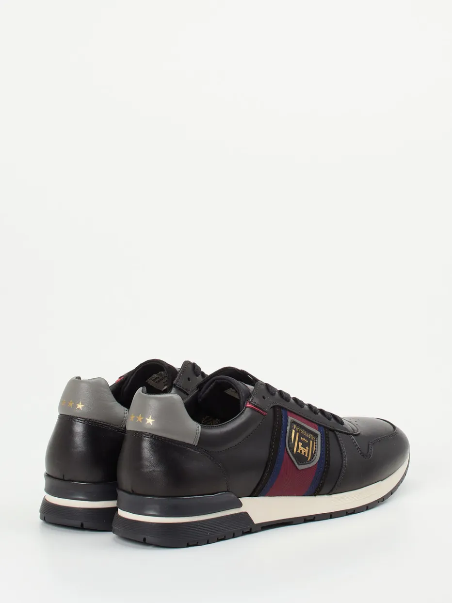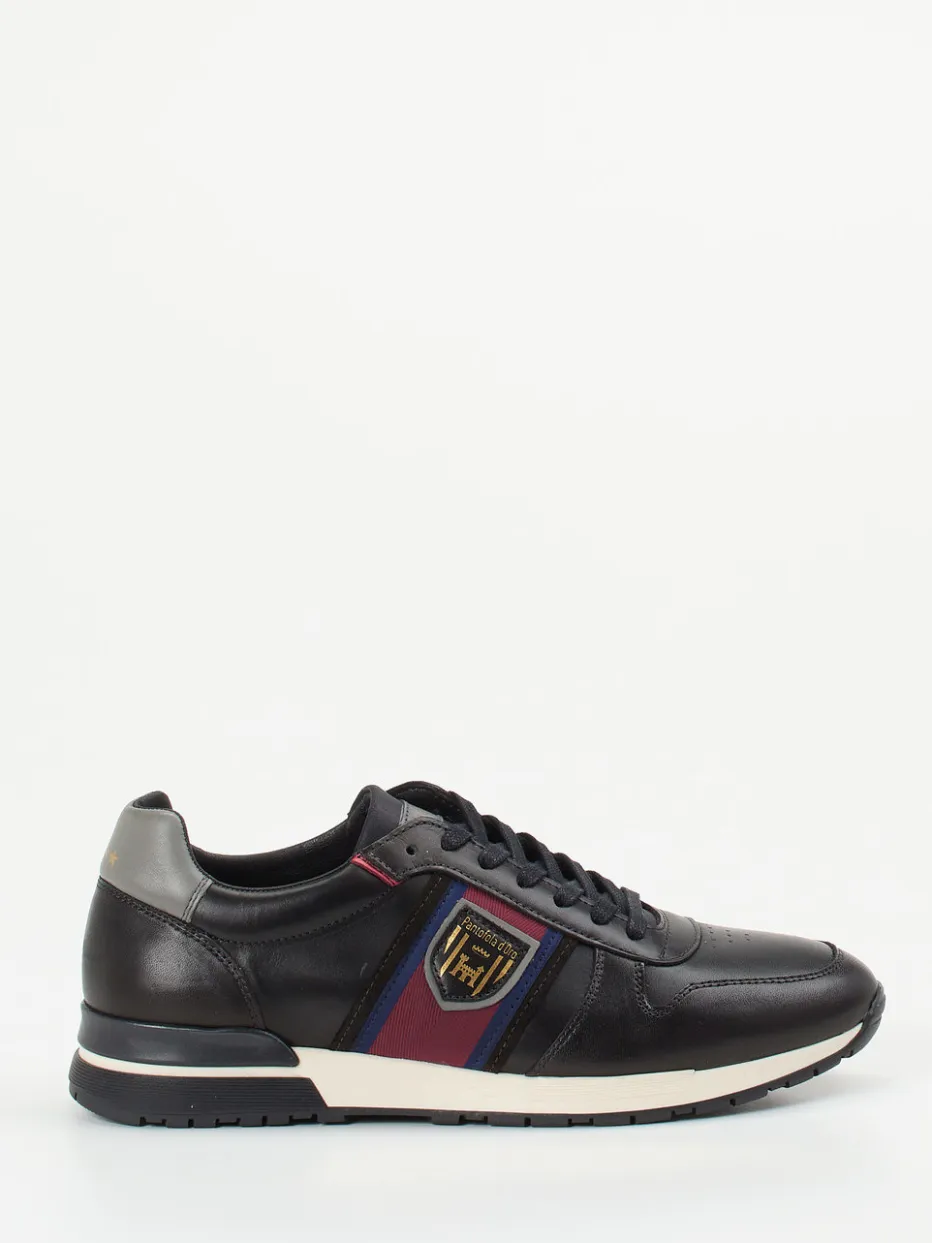 Retro-Statement fürs urbane Styling.Der Herren-Sneaker von Pantofola d’Oro vereint sportliche Retro-Vibes mit italienischer Designkompetenz. Für stilvolle Alltagslooks bietet das Modell aus edlem, mattem Kalbleder einen angenehmen Tragekomfort. Schwarze Grundflächen kontrastieren effektvoll mit bordeauxroten und dunkelblauen Akzenten sowie goldfarbenen Logoelementen. Kontraststreifen an den Seiten, gepolstertes Innenfutter aus Leder und eine griffige Gummisohle runden die klassische Runner-Silhouette ab. Ideal kombinierbar mit Chinohose und weißem Hemd für einen lässig-eleganten Auftritt. Pantofola d’Oro steht für sportlich-elegante Lässigkeit mit markentypischer Verarbeitungsqualität.