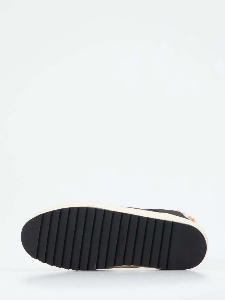 Urbaner Begleiter mit Komfortfaktor.Philippe Model interpretiert den klassischen High-Top Sneaker mit schwarzem Kalbleder und luxuriösem Innenfutter neu. Ideal für winterliche City-Streifzüge: Das genarbte Kalbleder sorgt für eine edle Anmutung, während das beige Textilfutter in Kunstfell-Optik warme Füße garantiert. Die kontrastierenden Schnürsenkel und das weiße Markenlogo an der Ferse setzen markante Akzente. Für sicheres Gehen sorgt die rutschfeste Gummisohle mit Haifischzahnprofil. Dieser Sneaker vereint Streetwear-Einflüsse mit funktionaler Wärme – und passt hervorragend zu Steppjacke und Denim. Markentypisch kombiniert Philippe Model Stilbewusstsein mit hochwertiger Verarbeitung.