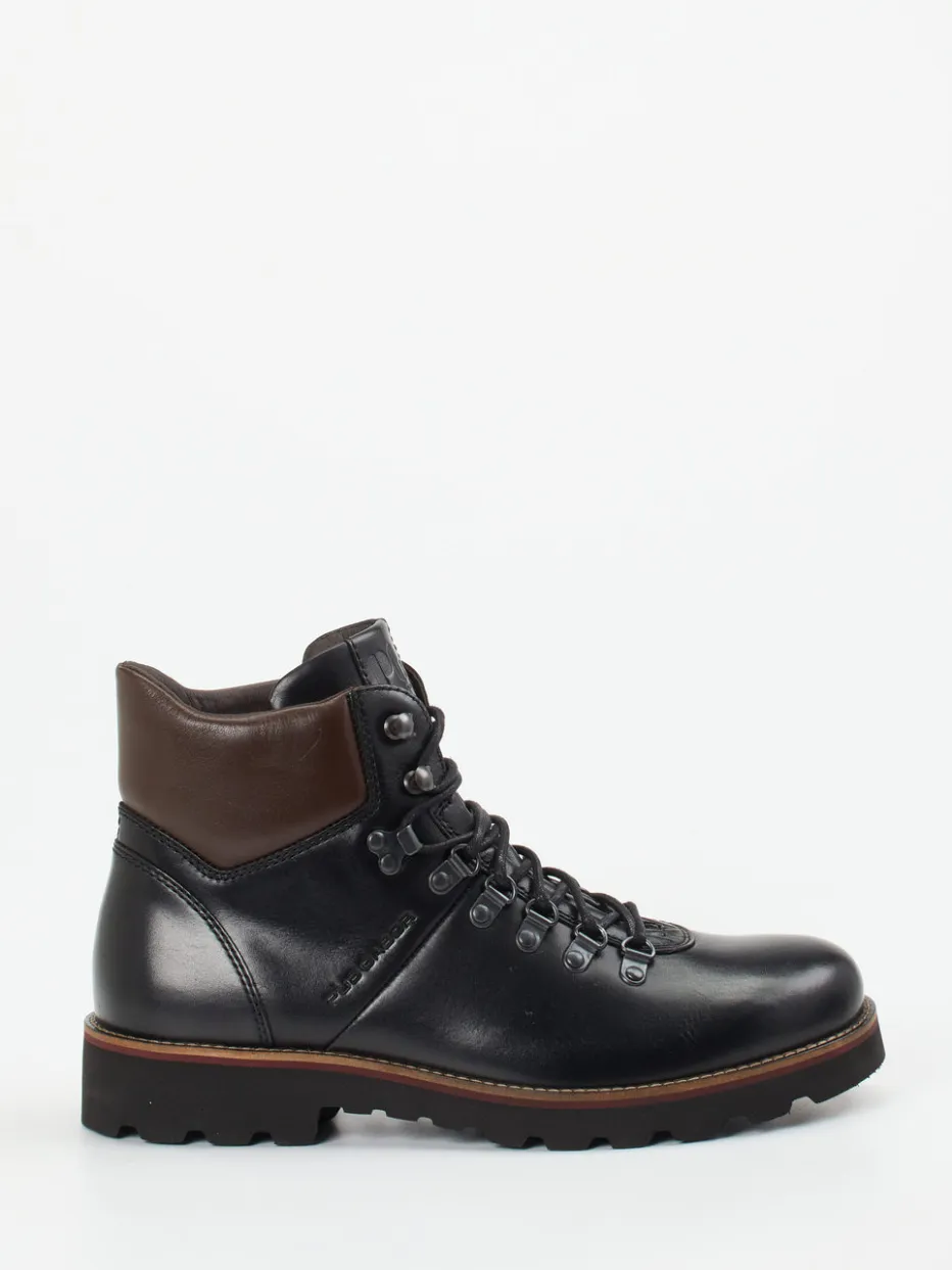 Ob auf herbstlichen Spazierwegen oder im städtischen Kontext – diese knöchelhohen Boots bieten modernen Komfort und funktionalen Stil. Das glänzende Kalbleder wirkt hochwertig und langlebig, während die schwarz-dunkelbraune Farbkombination eine dezente Kontrastwirkung erzeugt. Die robuste Schnürung mit Metallhaken sowie die stark profilierte Gummisohle erhöhen die Trittsicherheit auf wechselnden Untergründen. Der weich gepolsterte Schaftabschluss aus Textil sorgt für angenehmen Halt. Der Look verankert sich stilsicher zwischen Workwear und modischem „Quiet Luxury“.