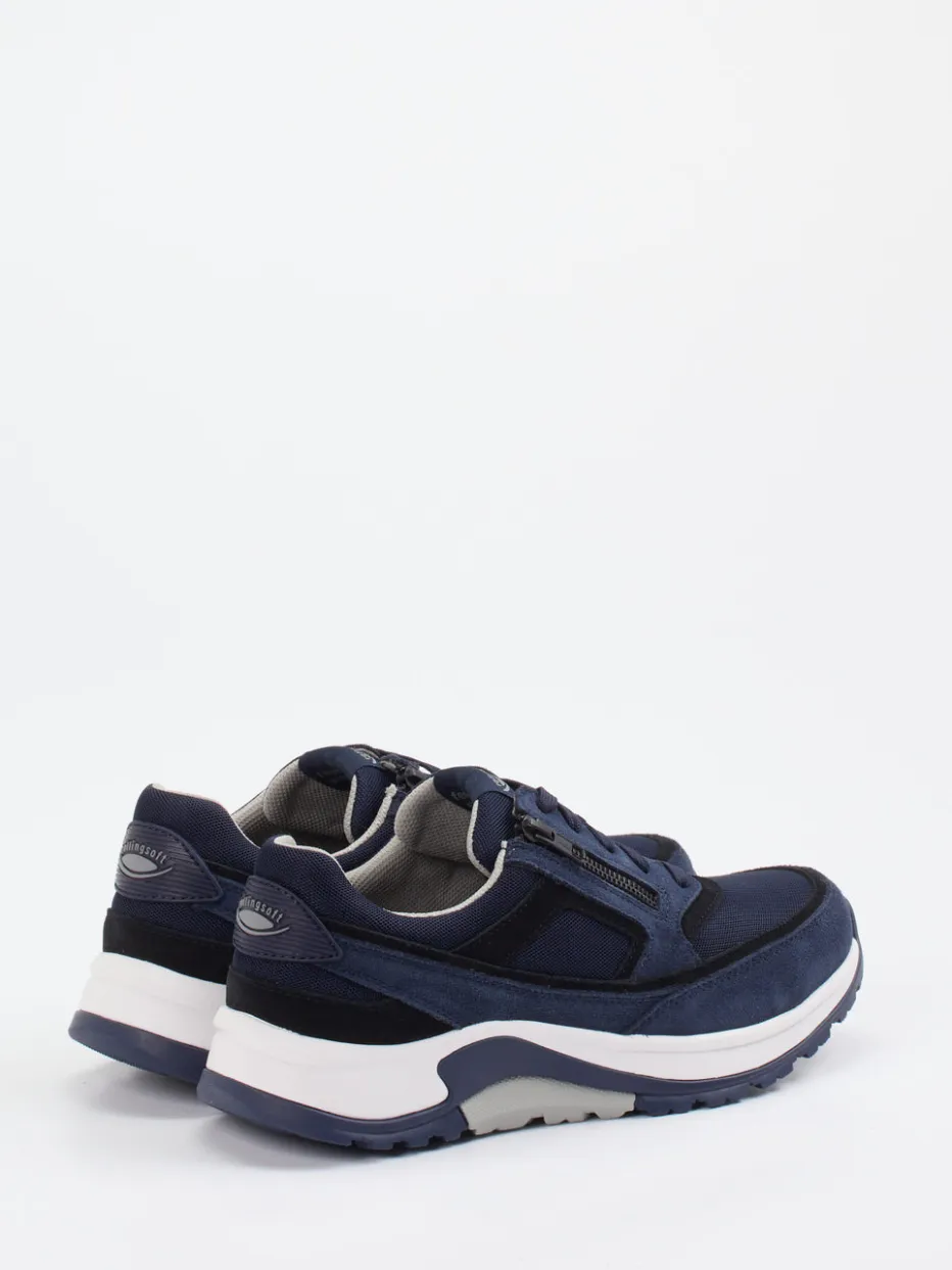 Frische Dynamik für bewegte Tage.Pius Gabor präsentiert einen alltagstauglichen Sneaker in sportlich-bulky Silhouette. Für ausgedehnte Wege in der Stadt oder auf Reisen bietet dieser Sneaker angenehme Leichtigkeit dank atmungsaktivem Mesh und samtig angeschliffenem Veloursleder in Marineblau. Die kontrastierende Gummisohle mit gutem Grip und Dämpfung sorgt für Stabilität. Highlights wie der seitliche Reißverschluss und gepolsterte Schaftrand erhöhen den Tragekomfort zusätzlich. Schwarz abgesetzte Overlays bringen moderne Streetwear-Ästhetik ins Spiel. Perfekt kombiniert mit legeren Urban Looks. Komfortables Tragegefühl im markentypischen Athleisure-Stil von Pius Gabor.