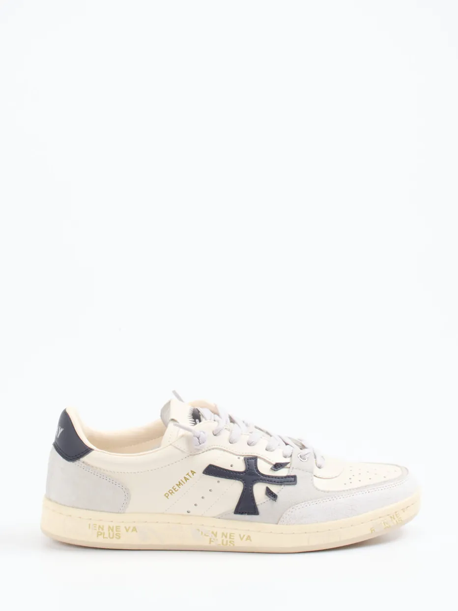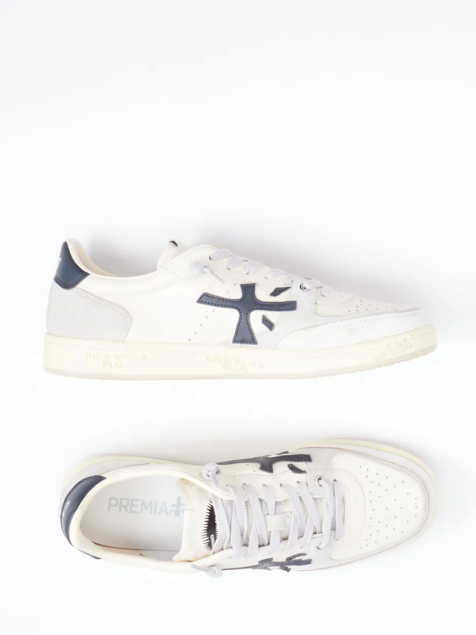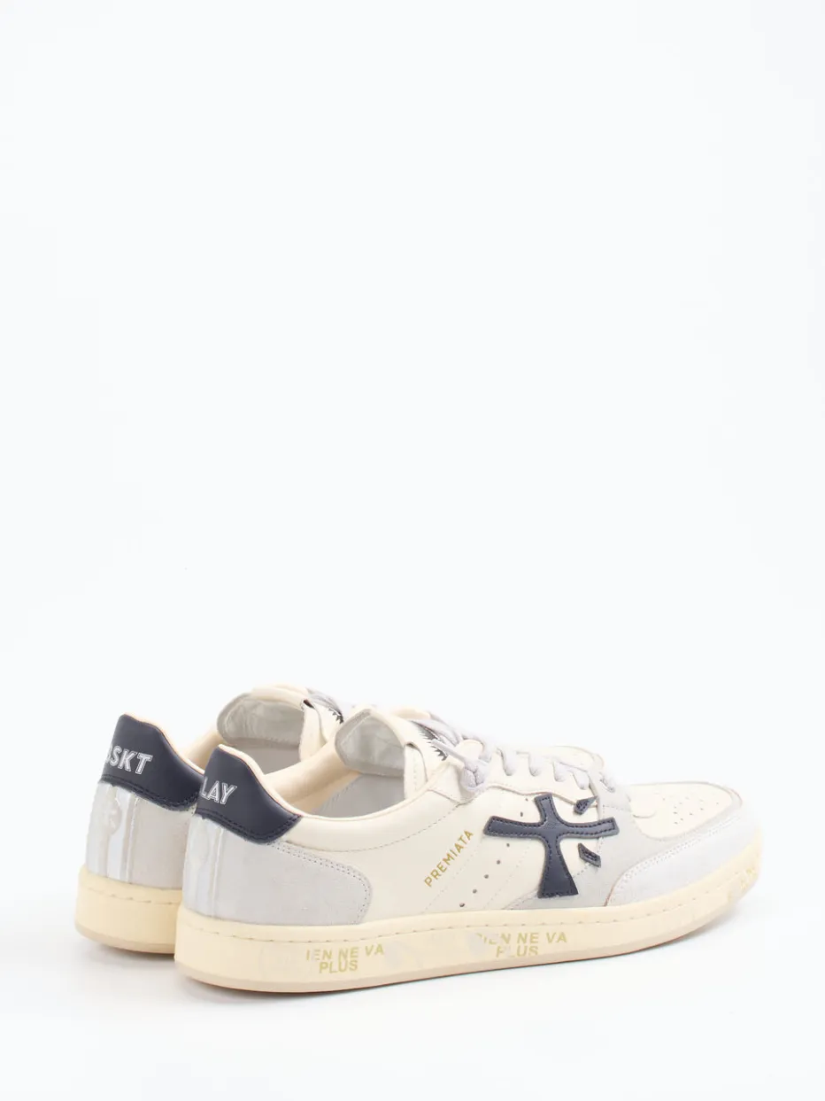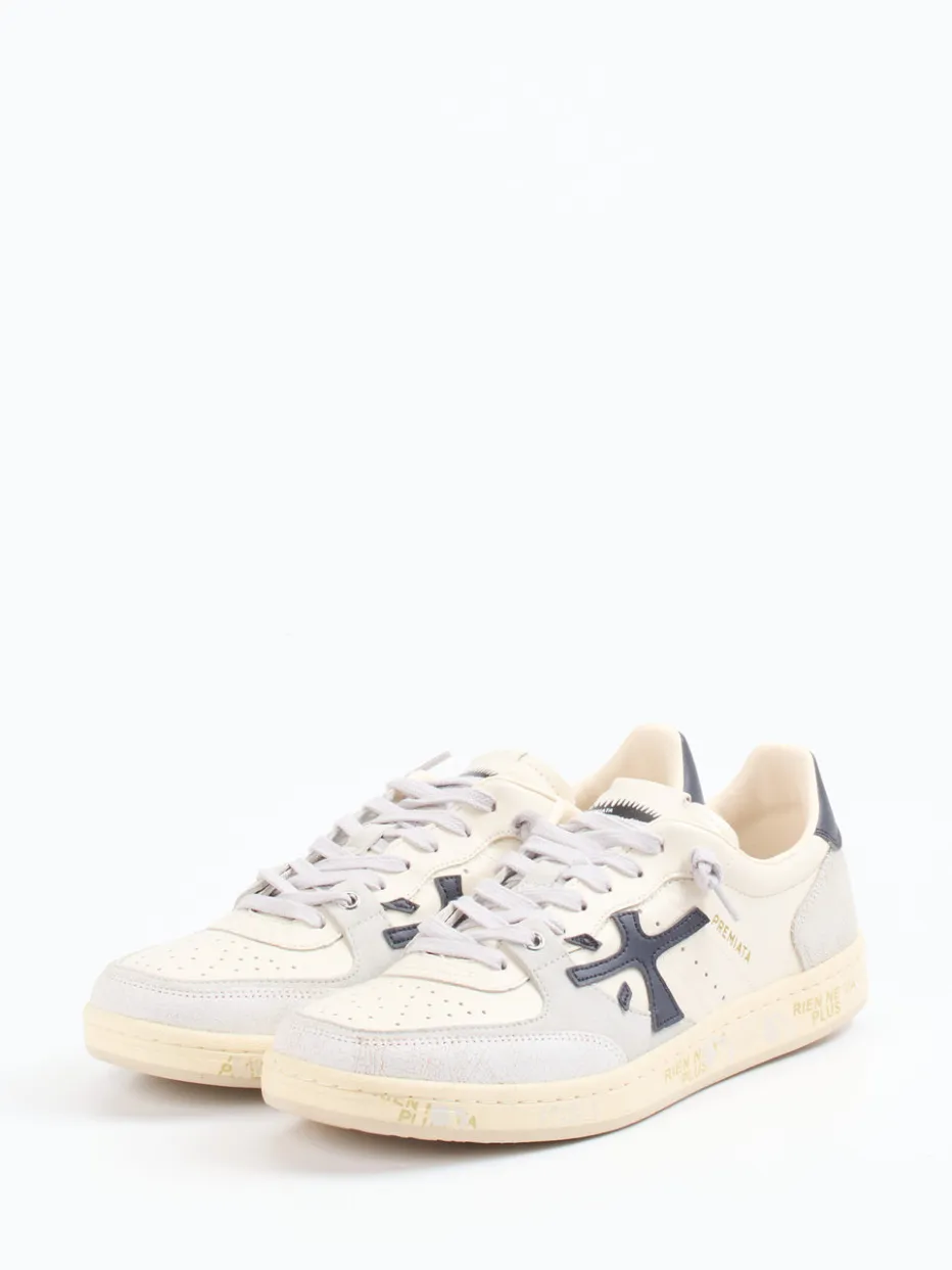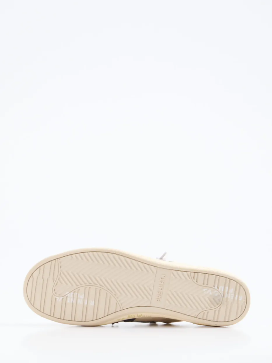 Moderner Klassiker mit Retro-Flair.Premiata präsentiert einen Unisex-Sneaker mit klassischer Low-Top-Silhouette und sportlich-lässigem Look. Ideal für urbane Freizeitmomente vereint dieser Sneaker hochwertiges Kalbleder mit samtig mattiertem Velours in Hellgrau. Das cremeweiße Obermaterial wird durch navyblaue Logo-Akzente und eine perforierte Zehenpartie ergänzt. Eine rutschfeste Gummisohle mit Schriftzug sowie die offene Schnürung sorgen für Komfort und Trittsicherheit. Inspiriert von Retro Court Designs der Stilrichtungen „Quiet Luxury“ und „Streetwear SS25“ ist das Modell vielseitig kombinierbar – etwa zu Chinohosen oder lässigen Sweatshirts. Premiata steht hier für traditionsbasierte Fertigung und designorientierte Alltagstauglichkeit.