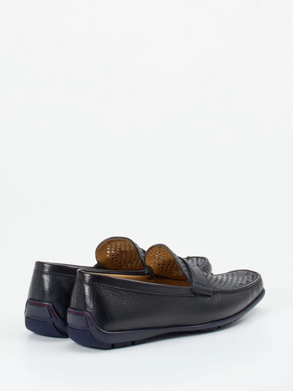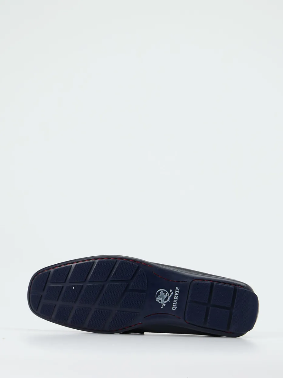 Luftiger Komfort für Büro und Freizeit.Quarvif bietet mit diesem Loafer einen stilvollen Herren-Mokassin für wärmere Monate. Die Kombination aus geprägtem Elchleder und perforiertem Vorderblatt bringt atmungsaktive Leichtigkeit in ein klassisch-flaches Design. Das dunkelblaue Modell setzt auf Ton-in-Ton-Verarbeitung mit fein gearbeiteter Naht und geprägtem Markenschriftzug auf der Lederbride. Die robuste Gummisohle mit Profil läuft bis zur Ferse hoch und unterstützt den sicheren Auftritt. Minimalistische Formensprache trifft auf Smart-Casual-Tauglichkeit – ideal für Bürolooks und entspannte Outfits. Ergänzt jeden Business-Hosenstil oder dunkelblauen Gürtel. Ein Herrenklassiker mit diskretem Detailfokus und klimatisierendem Tragekomfort.