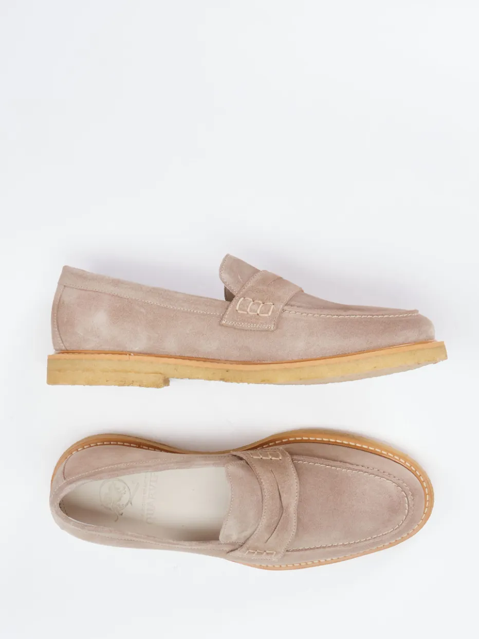 Vielseitiger Begleiter in edlem Taupe.Die Marke Quarvif setzt bei diesem Herrenschuh auf klassische Loafer-Form und zeitgemäßen Minimalismus. Ob im Büro oder bei entspannten Freizeitmomenten – dieser Slipper erfüllt stilbewusste Ansprüche ohne Kompromisse. Gefertigt aus fein geschliffenem Ziegenleder mit samtiger Haptik besticht er durch seine taupefarbene Oberfläche und harmonische Ton-in-Ton-Nähte. Die durchgenähte Mokassinnaht und die charakteristische Penny-Bride bringen Authentizität ins Design. Dank rahmengenähter Kreppsohle bietet er Flexibilität und Rutschfestigkeit für den Alltag. Ein hochwertiger Schuh für gepflegte Casual- und Business-Looks mit italienischer Handwerkskunst.