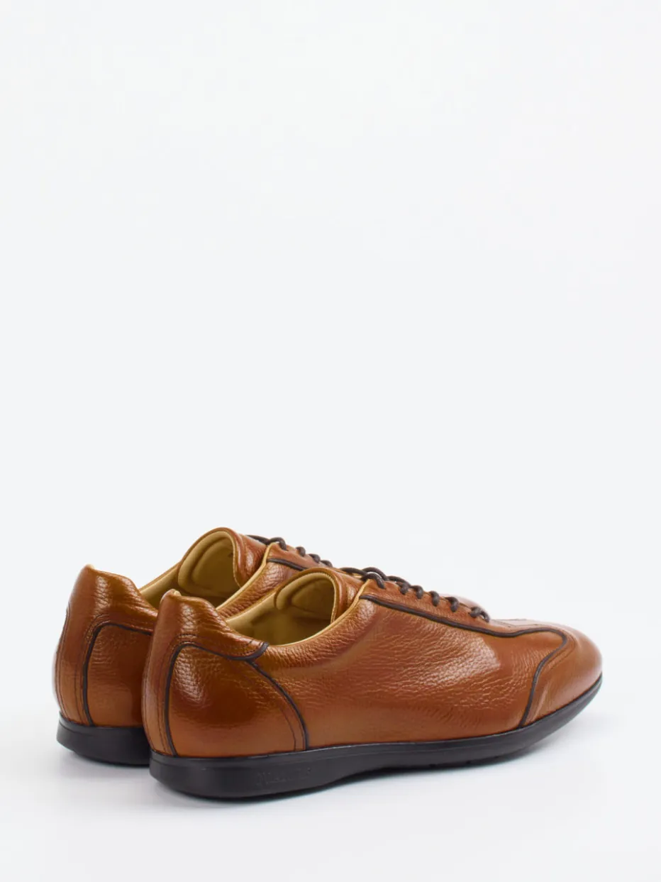 Ideal für urbane Alltagsszenarien oder das Büro im Business-Casual-Stil: Das cognacbraune, genarbte Hirschleder verleiht dem Modell eine hochwertige Ausstrahlung und liegt voll im Quiet-Luxury-Trend. Der schmal zulaufende Schnitt mit dunkelbrauner Schnürung, tonalen Ziernähten und einer sportlichen Flügelkappe unterstreicht den Retro-Charakter. Die schwarze Gummisohle ist durchgenäht und bietet sicheren Halt sowie Langlebigkeit. Innen sorgt ein weiches Lederfutter mit gepolstertem Fußbett für Komfort. Stilvoll kombinierbar mit Chino, Hemd oder Sakko.