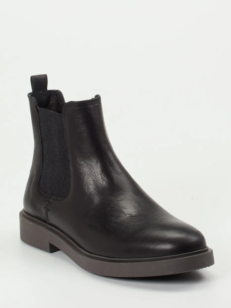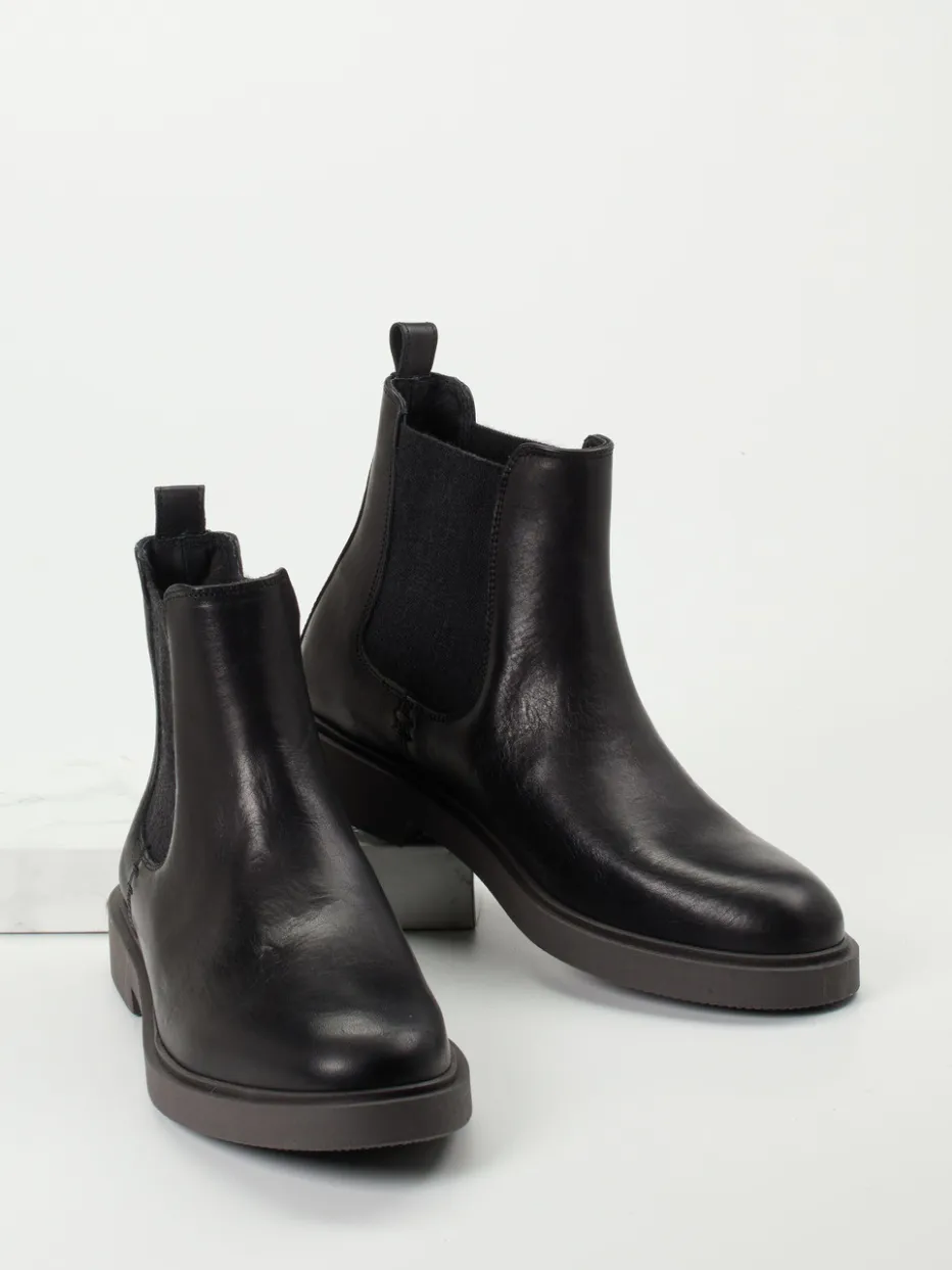 Schwarzer Allrounder für moderne Stilwelten.Ralph Harrison interpretiert die klassischen Chelsea Boots neu. Für Arbeitstage im Business-Stil oder urbane Freizeitlooks bieten diese knöchelhohen Stiefeletten aus hochwertigem Kalbleder mit matter Oberfläche und tonalen Elastikeinsätzen eine stilvolle Grundlage. Die tiefschwarze Farbgebung unterstreicht die klare Linienführung, während die rutschhemmende Gummisohle im Taupeton funktionale Akzente setzt. Zuglaschen am Schaftrand und das weich gepolsterte Fußbett betonen den durchdachten Tragekomfort. Die Anlehnung an „Quiet Luxury“ und „Heavy Sole“ verleiht dem Modell zeitgemäße Relevanz. Die präzise Verarbeitung steht für zurückhaltende Markenqualität mit modischer Souveränität.