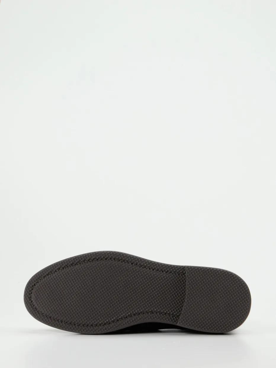 Feines Kalbleder in sattem Schwarz trifft auf klassisch-minimalistische Silhouette mit tonalen Elastikeinsätzen – ein stilvoller Allrounder für Büro und Alltag.